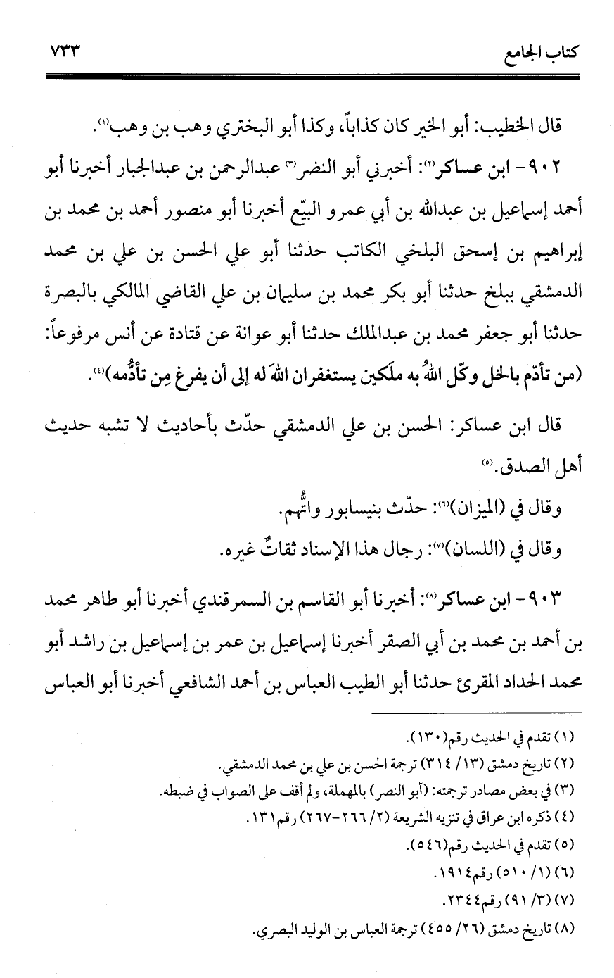 902 - ابن عساكر (¬1): أخبر في أبو النضر (¬2) عبد الرحمن بن عبد الجبار أخبرنا أبو أحمد إسماعيل بن عبد الله بن أبي عمرو البيّع أخبرنا أبو منصور أحمد بن محمد بن إبراهيم بن إسحاق البلخي الكاتب حدثنا أبو علي الحسن بن علي بن محمد الدمشقي ببلخ حدثنا أبو بكر محمد بن سليمان بن علي القاضي المالكي بالبصرة حدثنا أبو جعفر محمد بن عبد الملك حدثنا أبو عوانة عن قتادة عن أنس مرفوعًا: (من تأدّم بالخل وكّل اللهُ به ملَكين يستغفران اللهَ له إلى أن يفرغ مِن تأدُّمه) (¬3).