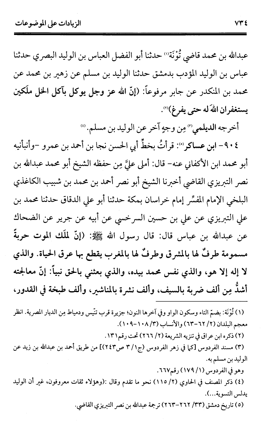 904 - ابن عساكر (¬1): قرأتُ بخطِّ أبي الحسن نجا بن أحمد بن عمرو - وأنبأنيه أبو محمد ابن الأكفاني عنه - قال: أملى عليَّ مِن حفظه الشيخ أبو محمد عبد الله بن نصر التبريزي القاضي أخبرنا الشيخ أبو نصر أحمد بن محمد بن شبيب الكاغذي البلخي الإمام المفسِّر إمام خراسان بمكة حدثنا أبو علي الدقاق حدثنا محمد بن علي التبريزي عن علي بن حسين السرخسي عن أبيه عن جرير عن الضحاك عن عبد الله بن عباس قال: قال رسول الله - صلى الله عليه وسلم -: (إنّ لملَك الموت حربةً مسمومة طرفٌ لها بالمشرق وطرفٌ لها بالمغرب يقطع بها عرق الحياة. والذي لا إله إلا هو، والذي نفس محمد بيده، والذي بعثني بالحق نبيًّا: إنّ معالجته أشدُّ مِن ألف ضربة بالسيف، وألف نشرة بالمناشير، وألف طبخة في القدور،