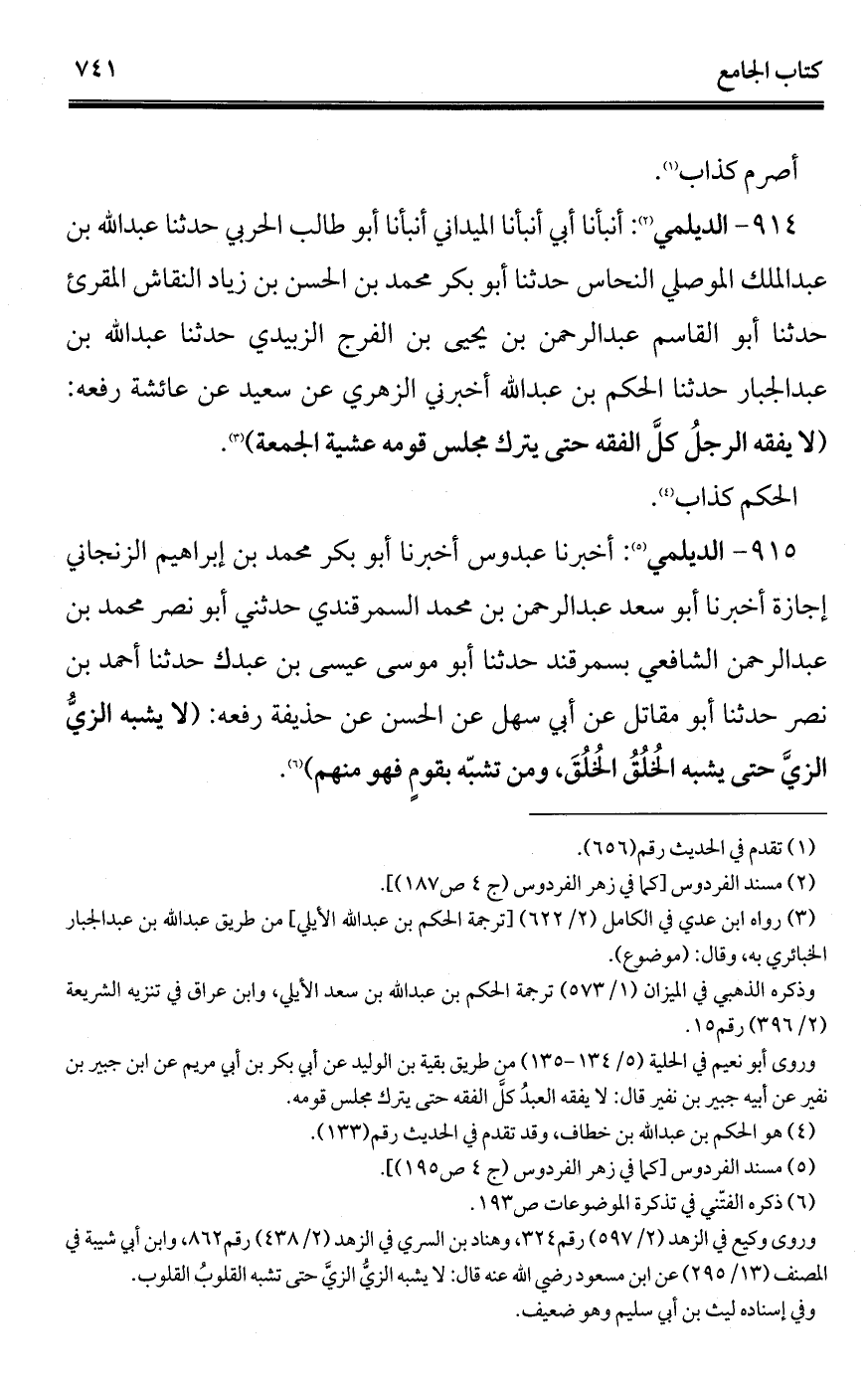 914 - الديلمي (¬1): أنبأنا أبي أنبأنا الميداني أنبأنا أبو طالب الحربي حدثنا عبد الله بن عبد الملك الموصلي النحاس حدثنا أبو بكر محمد بن الحسن بن زياد النقاش المقرئ حدثنا أبو القاسم عبد الرحمن بن يحيى بن الفرج الزبيدي حدثنا عبد الله بن عبد الجبار حدثنا الحكم بن عبد الله أخبرني الزهري عن سعيد عن عائشة رفعه: (لا يفقه الرجلُ كلَّ الفقه حتَّى يترك مجلس قومه عشية الجمعة) (¬2).