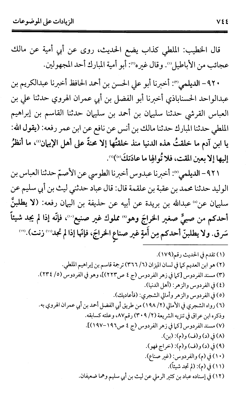 920 - الديلمي (¬1): أخبرنا أبو علي الحسن بن أحمد الحافظ أخبرنا عبد الكريم بن عبد الواحد الحسناباذي أخبرنا أبو الفضل بن أبي عمران الهروي حدثنا علي بن العباس القرشي حدثنا سليمان بن أحمد بن سليمان حدثنا القاسم بن إبراهيم الملطي حدثنا المبارك حدثنا مالك بن أنس عن نافع عن ابن عمر رفعه: (يقول الله: يا ابن آدم ما خلقتُ هذه الدنيا منذ خلقتُها إلا محنةً على أهل الإيمان (¬2)، ما أنظرُ إليها إلا بعين المقت، فلا تُوالهِا ما عادَتكَ) (¬3) (¬4).