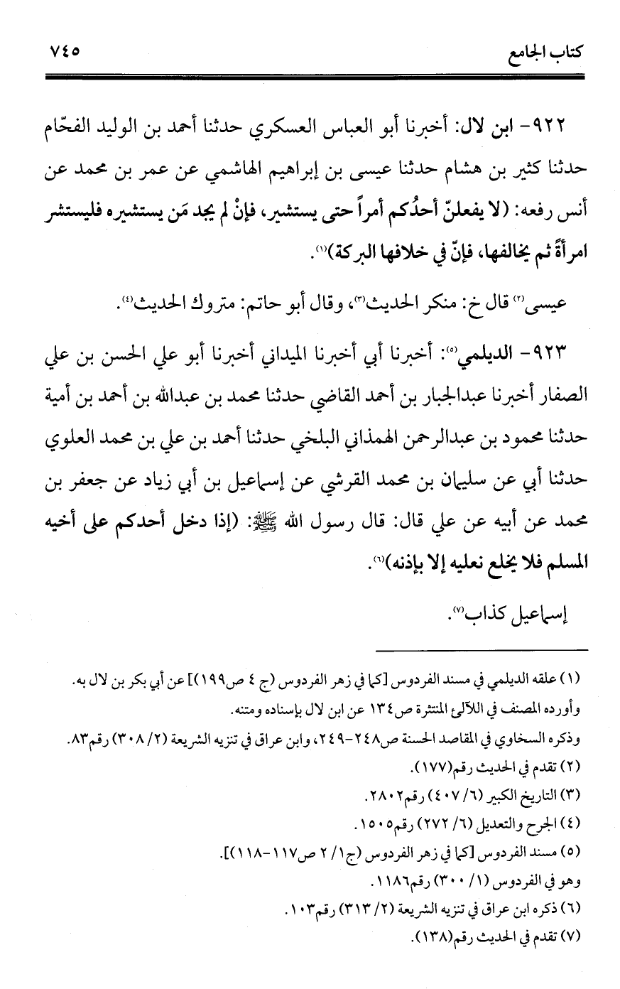 923 - الديلمي (¬1): أخبرنا أبي أخبرنا الميداني أخبرنا أبو علي الحسن بن علي الصفار أخبرنا عبد الجبار بن أحمد القاضي حدثنا محمد بن عبد الله بن أحمد بن أمية حدثنا محمود بن عبد الرحمن الهمذاني البلخي حدثنا أحمد بن علي بن محمد العلوي حدثنا أبي عن سليمان بن محمد القرشي عن إسماعيل بن أبي زياد عن جعفر بن محمد عن أبيه عن علي قال: قال رسول الله - صلى الله عليه وسلم -: (إذا دخل أحدكم على أخيه المسلم فلا يخلع نعليه إلا بإذنه) (¬2).