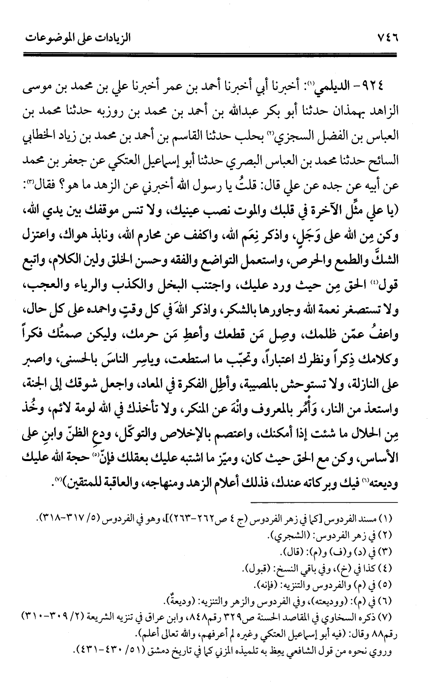 924 - الديلمي (¬1): أخبرنا أبي أخبرنا أحمد بن عمر أخبرنا علي بن محمد بن موسى الزاهد بهمذان حدثنا أبو بكر عبد الله بن أحمد بن محمد بن روزبه حدثنا محمد بن العباس بن الفضل السجزي (¬2) بحلب حدثنا القاسم بن أحمد بن محمد بن زياد الخطابي السائح حدثنا محمد بن العباس البصري حدثنا أبو إسماعيل العتكي عن جعفر بن محمد عن أبيه عن جده عن علي قال: قلتُ يا رسول الله أخبرني عن الزهد ما هو؟ فقال (¬3): (يا علي مثِّل الآخرة في قلبك والموت نصب عينيك، ولا تنس موقفك بين يدي الله، وكن مِن الله على وَجَلٍ، واذكر نِعَم الله، واكفف عن محارم الله، ونابذ هواك، واعتزل الشكَّ والطمع والحرص، واستعمل التواضع والفقه وحسن الخلق ولين الكلام، واتبع قول (¬4) الحق مِن حيث ورد عليك، واجتنب البخل والكذب والرياء والعجب، ولا تستصغر نعمة الله وجاورها بالشكر، واذكر اللهَ في كل وقتٍ واحمده على كل حال، واعفُ عمّن ظلمك، وصِل مَن قطعك وأعطِ مَن حرمك، وليكن صمتُك فكرًا وكلامك ذِكرًا ونظرك اعتبارًا، وتحبّب ما استطعت، وياسِر الناسَ بالحسنى، واصبر على النازلة، ولا تستوحش بالمصيبة، وأطِل الفكرة في المعاد، واجعل شوقك إلى الجنّة، واستعذ من النار، وَأْمُر بالمعروف وانْهَ عن المنكر، ولا تأخذك في الله لومة لائم، وخُذ مِن الحلال ما شئت إذا أمكنك، واعتصم بالإخلاص والتوكّل، ودعِ الظنّ وابنِ على الأساس، وكن مع الحق حيث كان، وميّز ما اشتبه عليك بعقلك فإنّ (¬5) حجة الله عليك وديعته (¬6) فيك وبركاته عندك، فذلك أعلام الزهد ومنهاجه، والعاقبة للمتقين) (¬7).