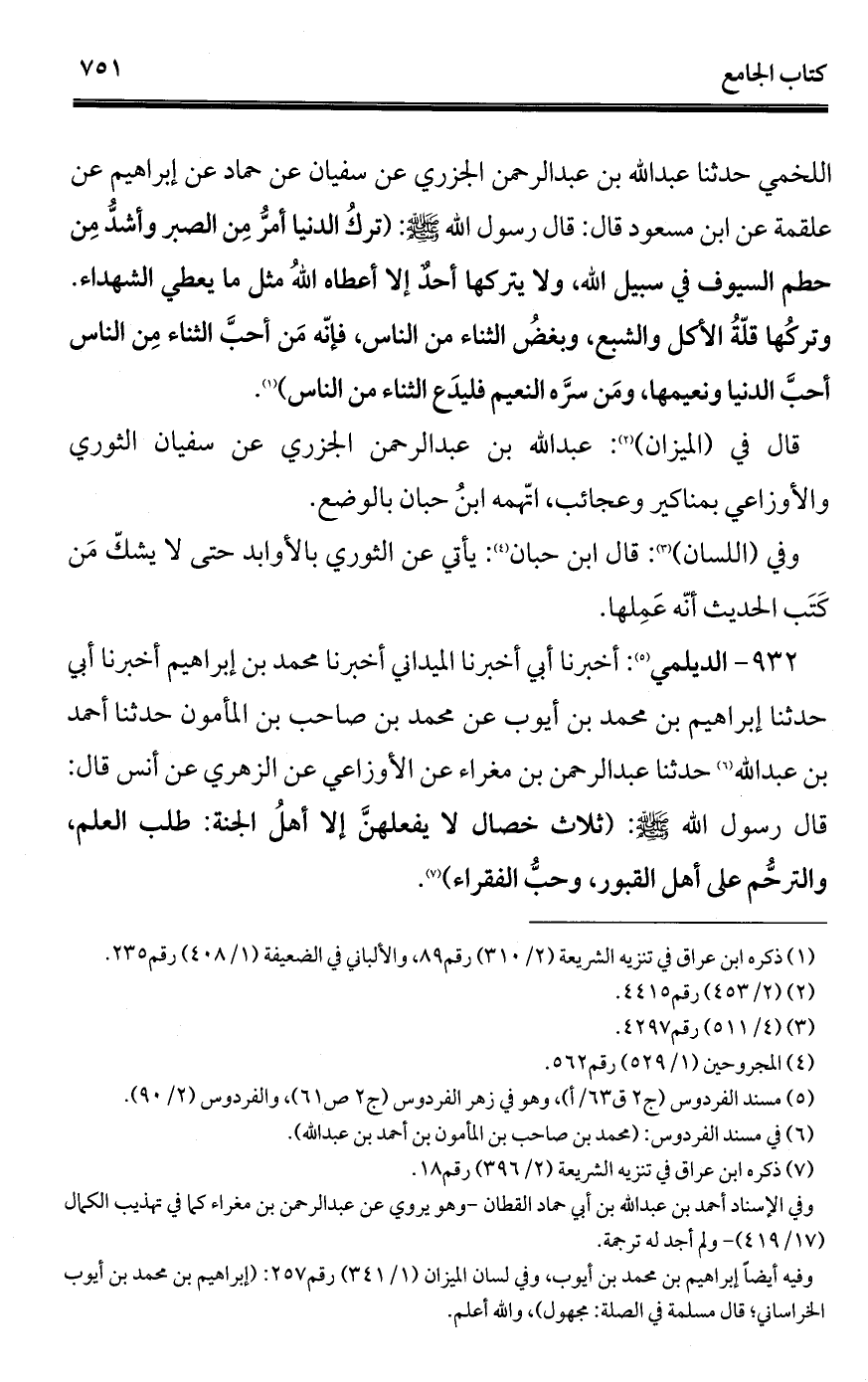 932 - الديلمي (¬1): أخبرنا أبي أخبرنا الميداني أخبرنا محمد بن إبراهيم أخبرنا أبي حدثنا إبراهيم بن محمد بن أيوب عن محمد بن صاحب بن المأمون حدثنا أحمد بن عبد الله (¬2) حدثنا عبد الرحمن بن مغراء عن الأوزاعي عن الزهري عن أنس قال: قال رسول الله - صلى الله عليه وسلم -: (ثلاث خصال لا يفعلهنَّ إلا أهلُ الجنة: طلب العلم، والترحُّم على أهل القبور، وحبُّ الفقراء) (¬3).