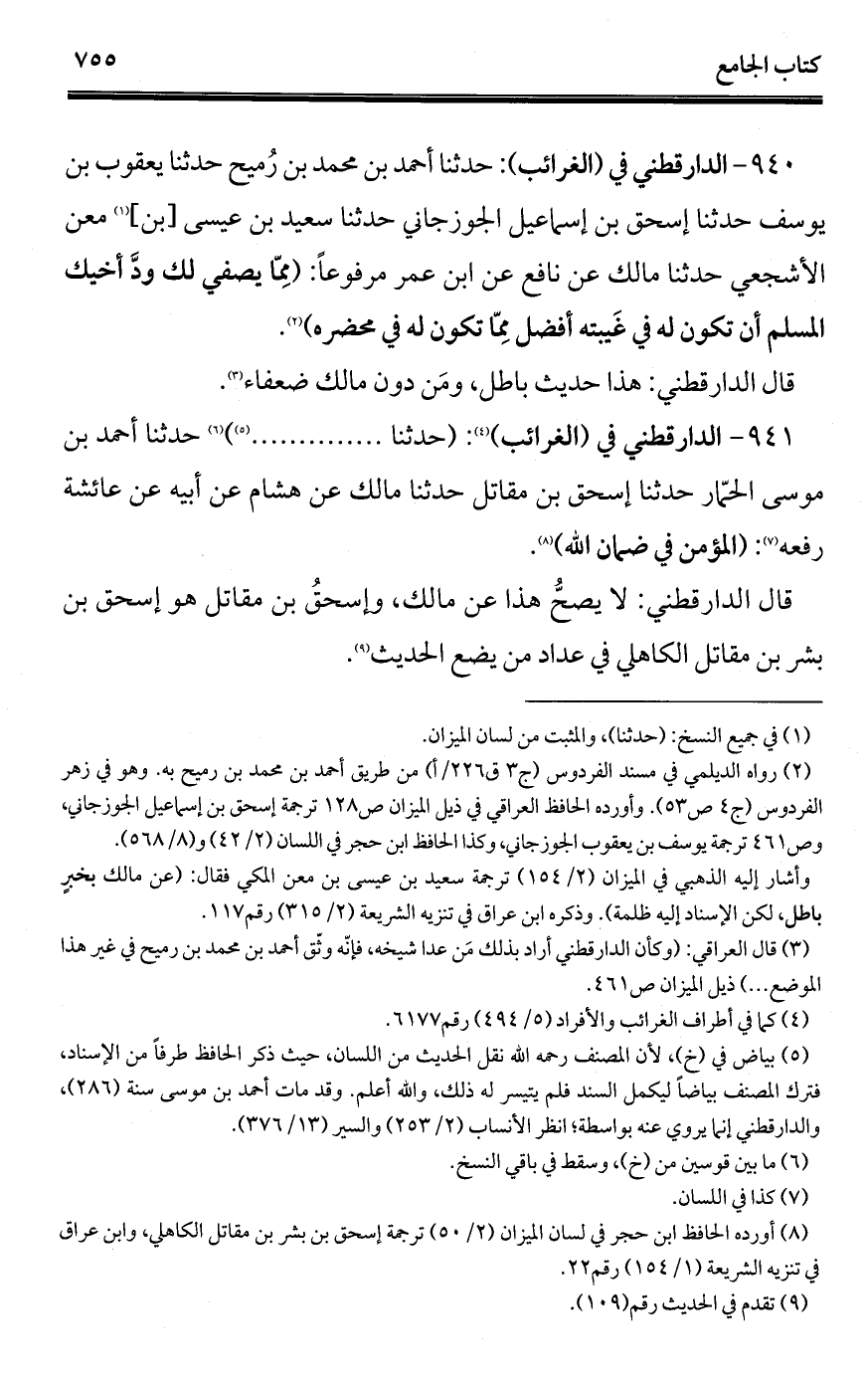 940 - الدارقطني في (الغرائب): حدثنا أحمد بن محمد بن رُميح حدثنا يعقوب بن يوسف حدثنا إسحاق بن إسماعيل الجوزجاني حدثنا سعيد بن عيسى [بن] (¬1) معن الأشجعي حدثنا مالك عن نافع عن ابن عمر مرفوعًا: (مِمّا يصفي لك ودَّ أخيك المسلم أن تكون له في غَيبته أفضل مِمّا تكون له في محضره) (¬2).