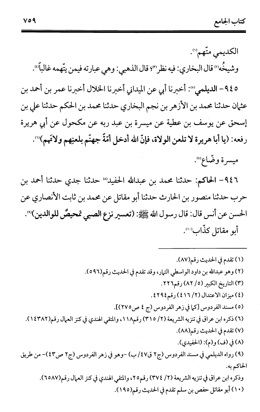 945 - الديلمي (¬1): أخبرنا أبي عن الميداني أخبرنا الخلال أخبرنا عمر بن أحمد بن عثمان حدثنا محمد بن الأزهر بن نجم البخاري حدثنا محمد بن الحكم حدثنا علي بن إسحاق عن يوسف بن عطية عن ميسرة بن عبد ربه عن مكحول عن أبي هريرة رفعه: (يا أبا هريرة لا تلعن الولاة، فإنّ الله أدخل أمّةً جهنّم بلعنِهم ولاتَهم) (¬2).