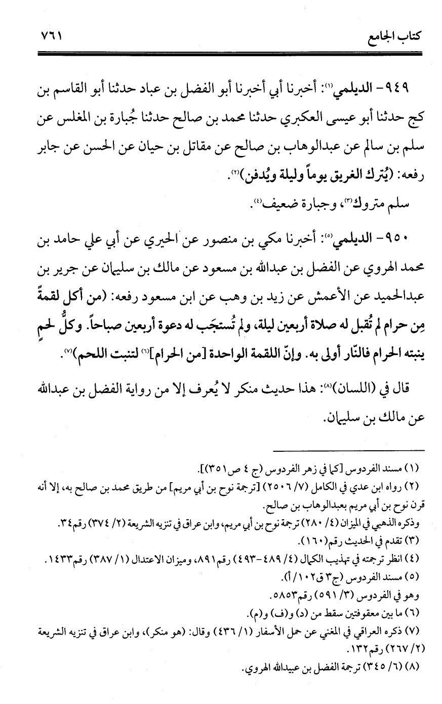 949 - الديلمي (¬1): أخبرنا أبي أخبرنا أبو الفضل بن عباد حدثنا أبو القاسم بن كج حدثنا أبو عيسى العكبري حدثنا محمد بن صالح حدثنا جُبارة بن المغلس عن سلم بن سالم عن عبد الوهاب بن صالح عن مقاتل بن حيان عن الحسن عن جابر رفعه: (يُترك الغريق يومًا وليلة ويُدفن) (¬2).