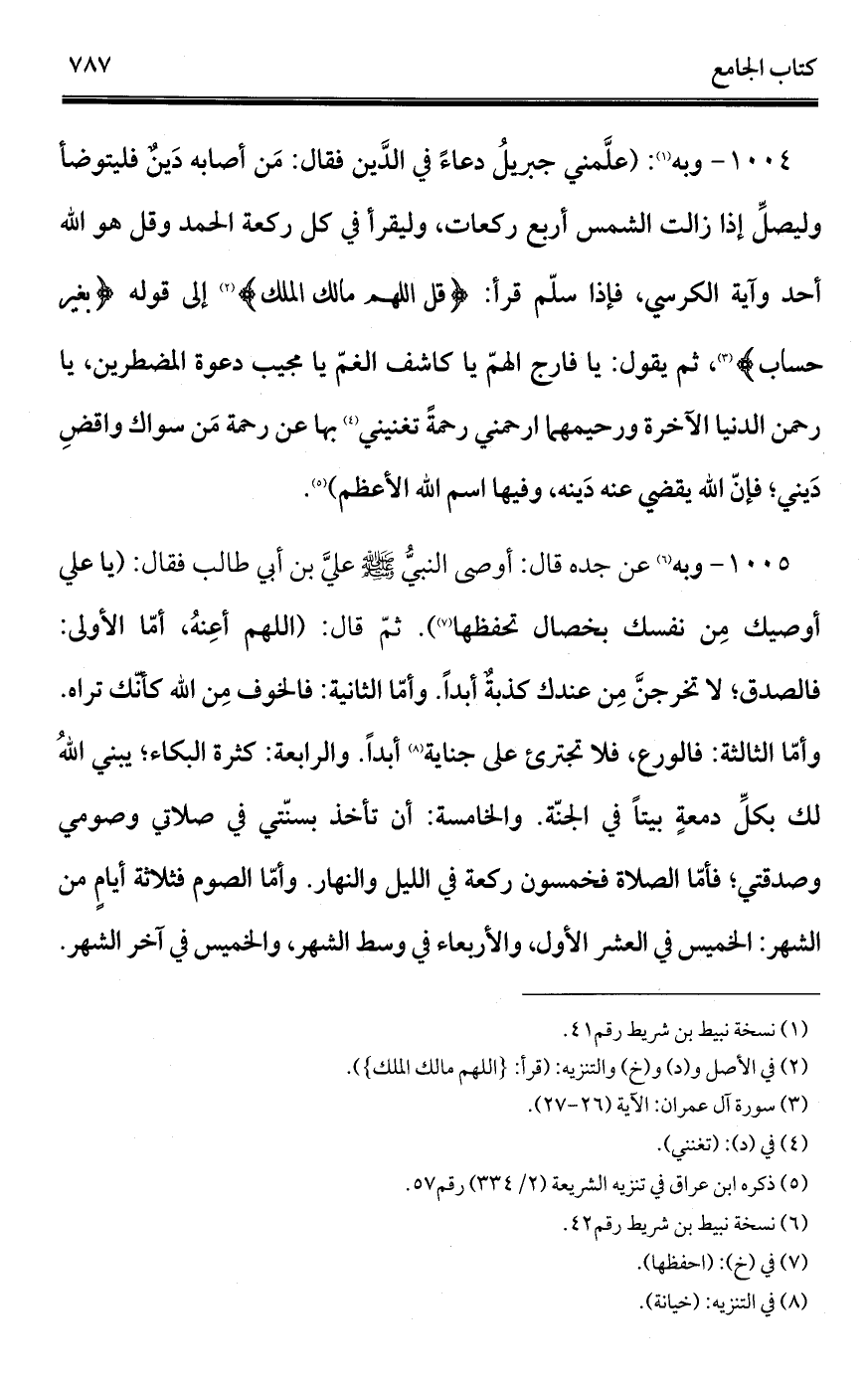 1004 - وبه (¬1): (علَّمني جبريلُ دعاءً في الدَّين فقال: مَن أصابه دَينٌ فليتوضأ وليصلِّ إذا زالت الشمس أربع ركعات، وليقرأ في كل ركعة الحمد وقل هو الله أحد وآية الكرسي، فإذا سلّم قرأ: {قل اللهم مالك الملك} (¬2) إلى قوله {بغير حساب} (¬3)، ثم يقول: يا فارج الهمّ يا كاشف الغمّ يا مجيب دعوة المضطرين، يا رحمن الدنيا الآخرة ورحيمهما ارحمني رحمةً تغنيني (¬4) بها عن رحمة مَن سواك واقضِ دَيني؛ فإنّ الله يقضي عنه دَينه، وفيها اسم الله الأعظم) (¬5).