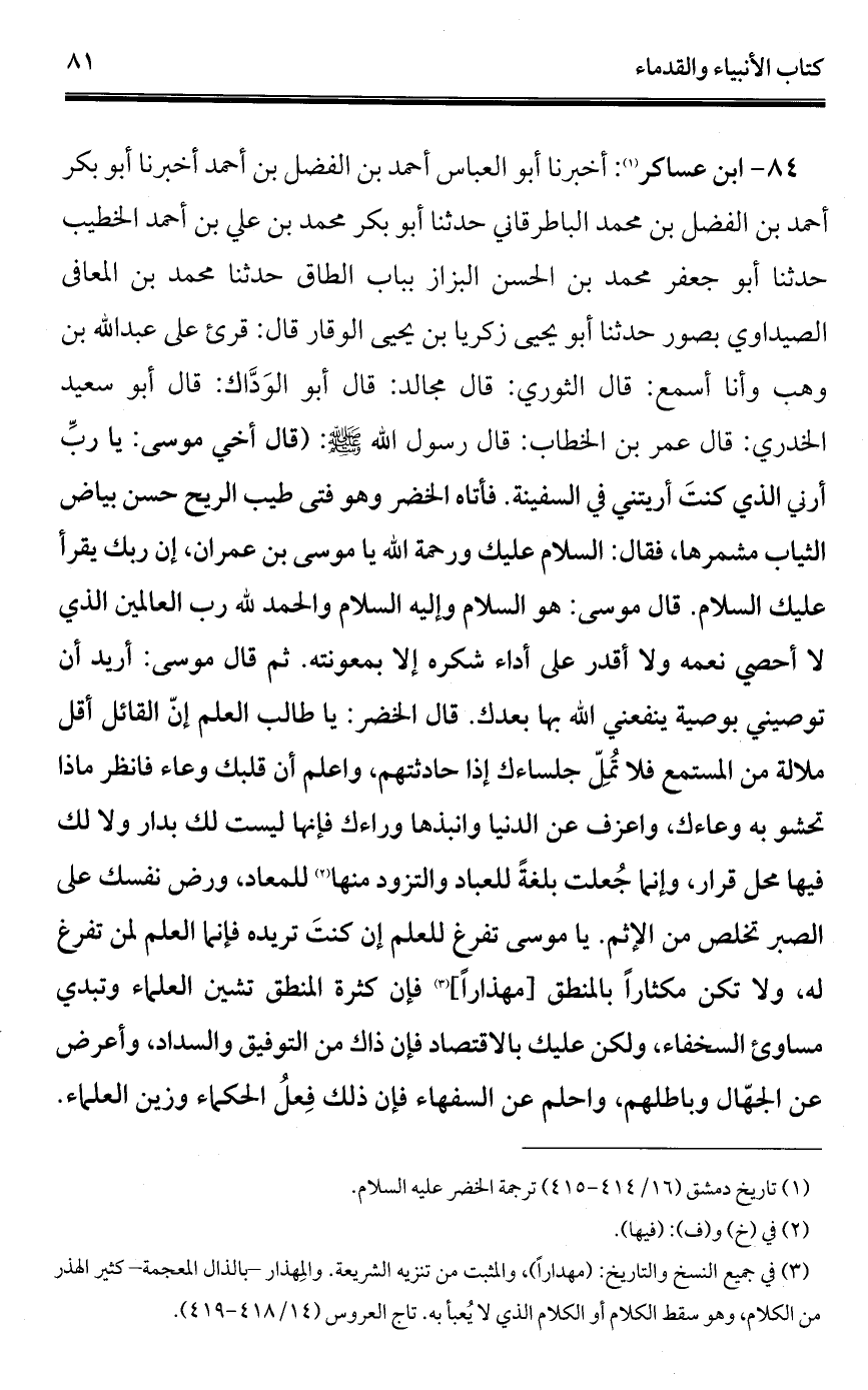 84 - ابن عساكر (¬1): أخبرنا أبو العباس أحمد بن الفضل بن أحمد أخبرنا أبو بكر أحمد بن الفضل بن محمد الباطرقاني حدثنا أبو بكر محمد بن علي بن أحمد الخطيب حدثنا أبو جعفر محمد بن الحسن البزاز بباب الطاق حدثنا محمد بن المعافى الصيداوي بصور حدثنا أبو يحيى زكريا بن يحيى الوقار قال: قرئ على عبد الله بن وهب وأنا أسمع: قال الثوري: قال مجالد: قال أبو الوَدَّاك: قال أبو سعيد الخدري: قال عمر بن الخطاب: قال رسول الله - صلى الله عليه وسلم -: (قال أخي موسى: يا ربِّ أرني الَّذي كنتَ أريتني في السفينة. فأتاه الخضر وهو فتى طيب الريح حسن بياض الثياب مشمرها، فقال: السلام عليك ورحمة الله يا موسى بن عمران، إن ربك يقرأ عليك السلام. قال موسى: هو السلام وإليه السلام والحمد لله رب العالمين الَّذي لا أحصي نعمه ولا أقدر على أداء شكره إلا بمعونته. ثم قال موسى: أريد أن توصيني بوصية ينفعني الله بها بعدك. قال الخضر: يا طالب العلم إنّ القائل أقل ملالة من المستمع فلا تُمِلّ جلساءك إذا حادثتهم، واعلم أن قلبك وعاء فانظر ماذا تحشو به وعاءك، واعزف عن الدنيا وانبذها وراءك فإنها ليست لك بدار ولا لك فيها محل قرار، وإنما جُعلت بلغةً للعباد والتزود منها (¬2) للمعاد، ورض نفسك على الصبر تخلص من الإثم. يا موسى تفرغ للعلم إن كنتَ تريده فإنما العلم لمن تفرغ له، ولا تكن مكثارًا بالمنطق [مهذارًا] (¬3) فإن كثرة المنطق تشين العلماء وتبدي مساوئ السخفاء، ولكن عليك بالاقتصاد فإن ذاك من التوفيق والسداد، وأعرض عن الجهّال وباطلهم، واحلم عن السفهاء فإن ذلك فِعلُ الحكماء وزين العلماء.