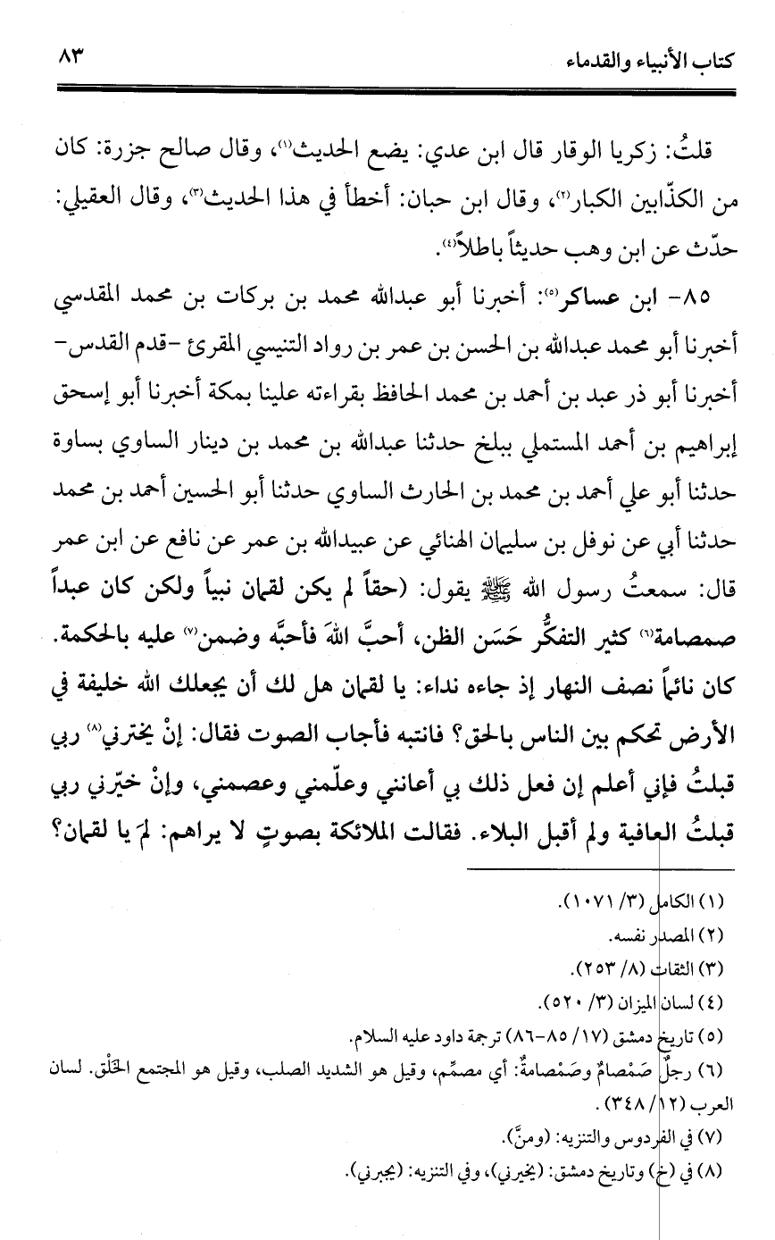 85 - ابن عساكر (¬1): أخبرنا أبو عبد الله محمد بن بركات بن محمد المقدسي أخبرنا أبو محمد عبد الله بن الحسن بن عمر بن رواد التنيسي المقرئ - قدم القدس - أخبرنا أبوو عبد بن أحمد بن محمد الحافظ بقراءته علينا بمكة أخبرنا أبو إسحاق إبراهيم بن أحمد المستملي ببلخ حدثنا عبد الله بن محمد بن دينار الساوي بساوة حدثنا أبو علي أحمد بن محمد بن الحارث الساوي حدثنا أبو الحسين أحمد بن محمد حدثنا أبي عن نوفل بن سليمان الهنائي عن عبيد الله بن عمر عن نافع عن ابن عمر قال: سمعتُ رسول الله - صلى الله عليه وسلم - يقول: (حقًّا لم يكن لقمان نبيًّا ولكن كان عبدًا صمصامة (¬2) كثير التفكُّر حَسَن الظن، أحبَّ اللهَ فأحبَّه وضمن (¬3) عليه بالحكمة. كان نائمًا نصف النهار إذ جاءه نداء: يا لقمان هل لك أن يجعلك الله خليفة في الأرض تحكم بين الناس بالحق؛ فانتبه فأجاب الصوت فقال: إنْ يخترني (¬4) ربي قبلتُ فإني أعلم إن فعل ذلك بي أعانني وعلّمني وعصمني، وإنْ خيّرني ربي قبلتُ العافية ولم أقبل البلاء. فقالت الملائكة بصوتٍ لا يراهم: لمَ يا لقمان؟