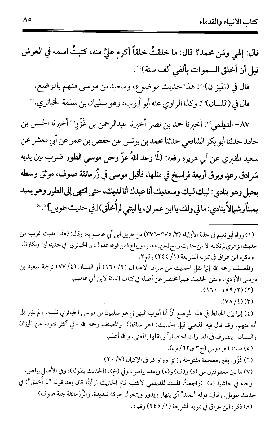 87 - الديلمي (¬1): أخبرنا حمد بن نصر أخبرنا عبد الرحمن بن غَزْوٍ (¬2) أخبرنا الحسن بن حامد حدثنا أبو بكر الشافعي حدثنا محمد بن يونس عن حفص بن عمر عن أبي معشر عن سعيد المقبري عن أبي هريرة رفعه: (لمّا وعد اللهُ عزّ وجل موسى الطور ضرب بين يديه سُرادق رعدٍ وبرق أريعة فراسخ في مثلها، فأقبل موسى في زُرمانقة صوف، موثق وسطه بحبل وهو ينادي: لبيك لبيك وسعديك أنا عبدك أنا لديك، حتَّى انتهى إلى الطور وهو يميد يمينًا وشمالًا ينادي: ما لي ولك يا ابن عمران، يا ليتني لم أُخلَق) [في حديث طويل] (¬3). (¬4)