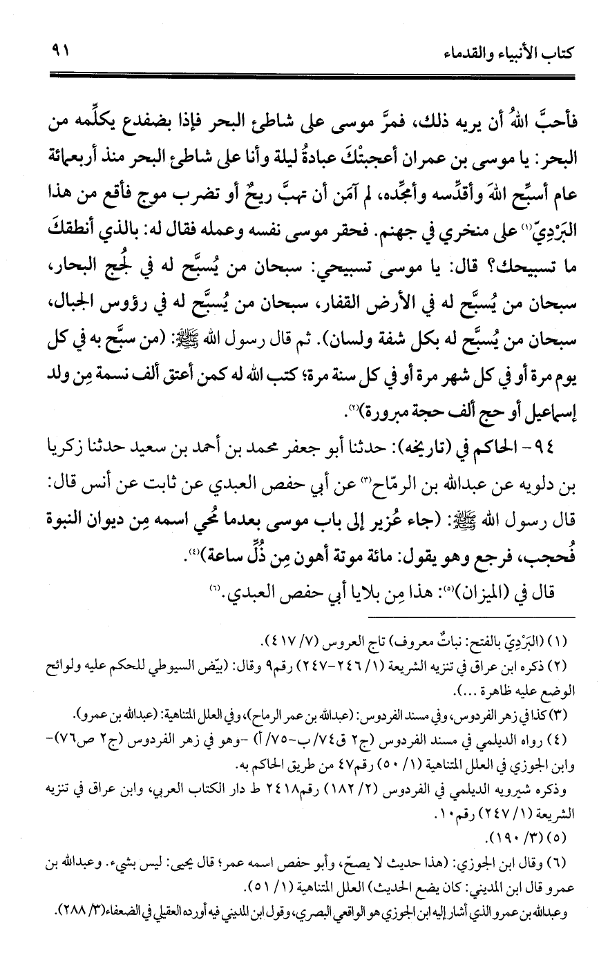 94 - الحاكم في (تاريخه): حدثنا أبو جعفر محمد بن أحمد بن سعيد حدثنا زكريا بن دلويه عن عبد الله بن الرمّاح (¬1) عن أبي حفص العمدي عن ثابت عن أنس قال: قال رسول الله - صلى الله عليه وسلم -: (جاء عُزير إلى باب موسى بعدما مُحي اسمه مِن ديوان النبوة فُحجب، فرجع وهو يقول: مائة موتة أهون مِن ذُلِّ ساعة) (¬2).