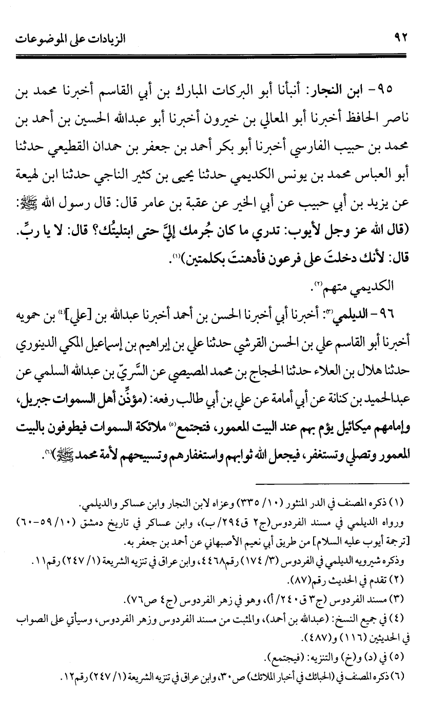 96 - الديلمي (¬1): أخبرنا أبي أخبرنا الحسن بن أحمد أخبرنا عبد الله بن [علي] (¬2) بن حمويه أخبرنا أبو القاسم علي بن الحسن القرشي حدثنا علي بن إبراهيم بن إسماعيل المكي الدينوري حدثنا هلال بن العلاء حدثنا الحجاج بن محمد المصيصي عن السَّريّ بن عبد الله السلمي عن عبد الحميد بن كنانة عن أبي أمامة عن علي بن أبي طالب رفعه: (مؤذِّن أهل السموات جبريل، وإمامامهم ميكائيل يؤم بهم عند البيت المعمور، فتجتمع (¬3) ملائكة السموات فيطوفون بالبيت المعمور وتصلي وتستغفر، فيجعل الله ثوابهم واستغفارهم وتسبيحهم لأمة محمد - صلى الله عليه وسلم -) (¬4).