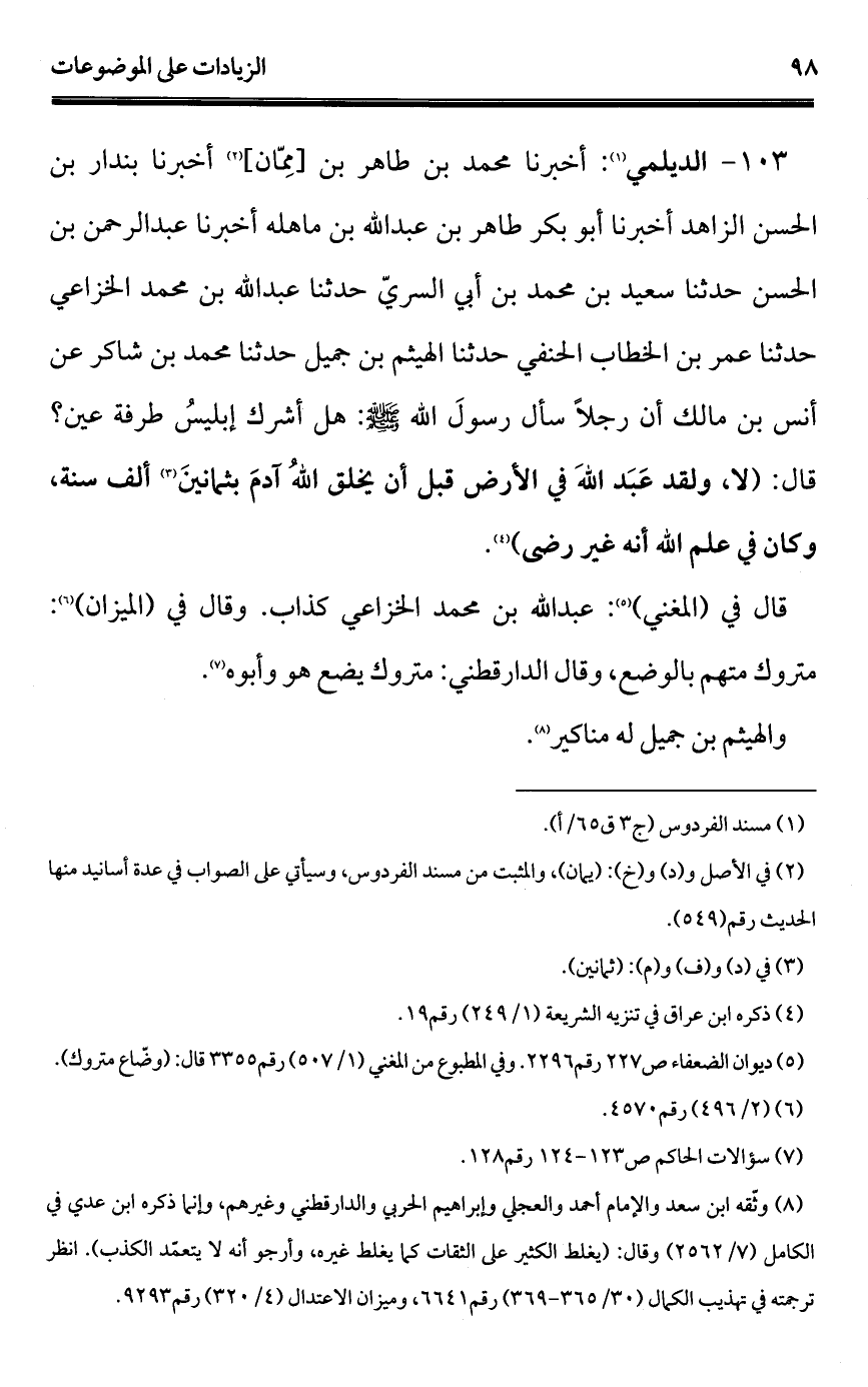 103 - الديلمي (¬1): أخبرنا محمد بن طاهر بن [مِمّان] (¬2) أخبرنا بندار بن الحسن الزاهد أخبرنا أبو بكر طاهر بن عبد الله بن ماهله أخبرنا عبد الرحمن بن الحسن حدثنا سعيد بن محمد بن أبي السريّ حدثنا عبد الله بن محمد الخزاعي حدثنا عمر بن الخطاب الحنفي حدثنا الهيثم بن جميل حدثنا محمد بن شاكر عن أنس بن مالك أن رجلًا سأل رسولَ الله - صلى الله عليه وسلم -: هل أشرك إبليسُ طرفة عين؟ قال: (لا، ولقد عَبَد اللهَ في الأرض قبل أن يخلق اللهُ آدمَ بثمانينَ (¬3) ألف سنة، وكان في علم الله أنَّه غير رضى) (¬4).