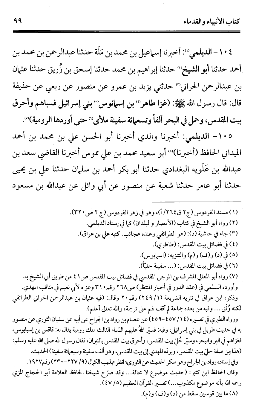 104 - الديلمي (¬1): أخبرنا إسماعيل بن محمد بن مَلّة حدثنا عبد الرحمن بن محمد بن أحمد حدثنا أبو الشيخ (¬2) حدثنا إبراهيم بن محمد حدثنا إسحاق بن زُريق حدثنا عثمان بن عبد الرحمن الحراني (¬3) حدثني يزيد بن عمرو عن منصور عن ربعي عن حذيفة قال: قال رسول الله - صلى الله عليه وسلم -: (غزا طاهر (¬4) بن إسمانوس (¬5) بني إسرائيل فسباهم وأحرق بيت المقدس، وحمل في البحر ألفًا وتسعمائة سفينة ملأى (¬6) حتَّى أوردها الرومية) (¬7).