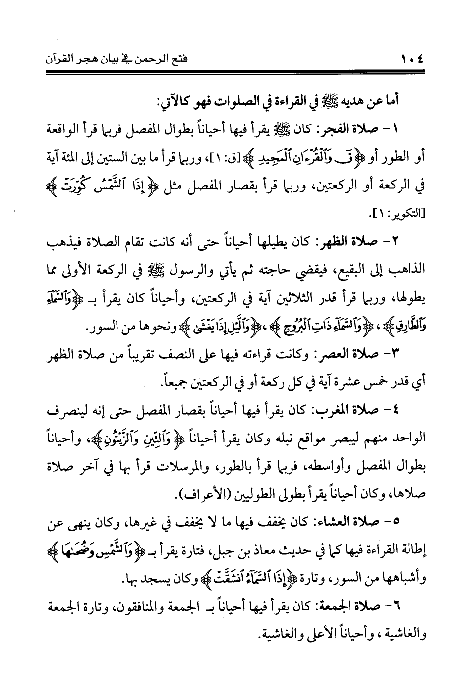 1 - صلاة الفجر: كان - صلى الله عليه وسلم - يقرأ فيها أحياناً بطوال المفصل فربما قرأ الواقعة أو الطور أو {ق وَالْقُرْآنِ الْمَجِيدِ}، وربما قرأ ما بين الستين إلى المئة آية في الركعة أو الركعتين، وربما قرأ بقصار المفصل مثل {إِذَا الشَّمْسُ كُوِّرَتْ}.
