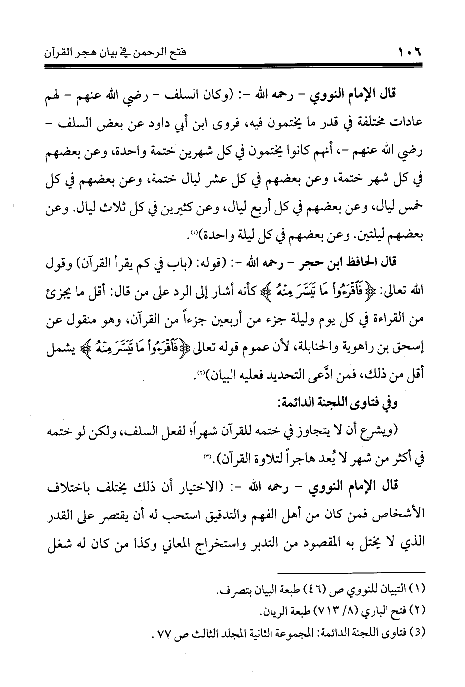 قال الإمام النووي - رحمه الله -: (وكان السلف - رضي الله عنهم - لهم عادات مختلفة في قدر ما يختمون فيه، فروى ابن أبي داود عن بعض السلف - رضي الله عنهم -، أنهم كانوا يختمون في كل شهرين ختمة واحدة، وعن بعضهم في كل شهر ختمة، وعن بعضهم في كل عشر ليال ختمة، وعن بعضهم في كل خمس ليال، وعن بعضهم في كل أربع ليال، وعن كثيرين في كل ثلاث ليال. وعن بعضهم ليلتين. وعن بعضهم في كل ليلة واحدة) (¬1).