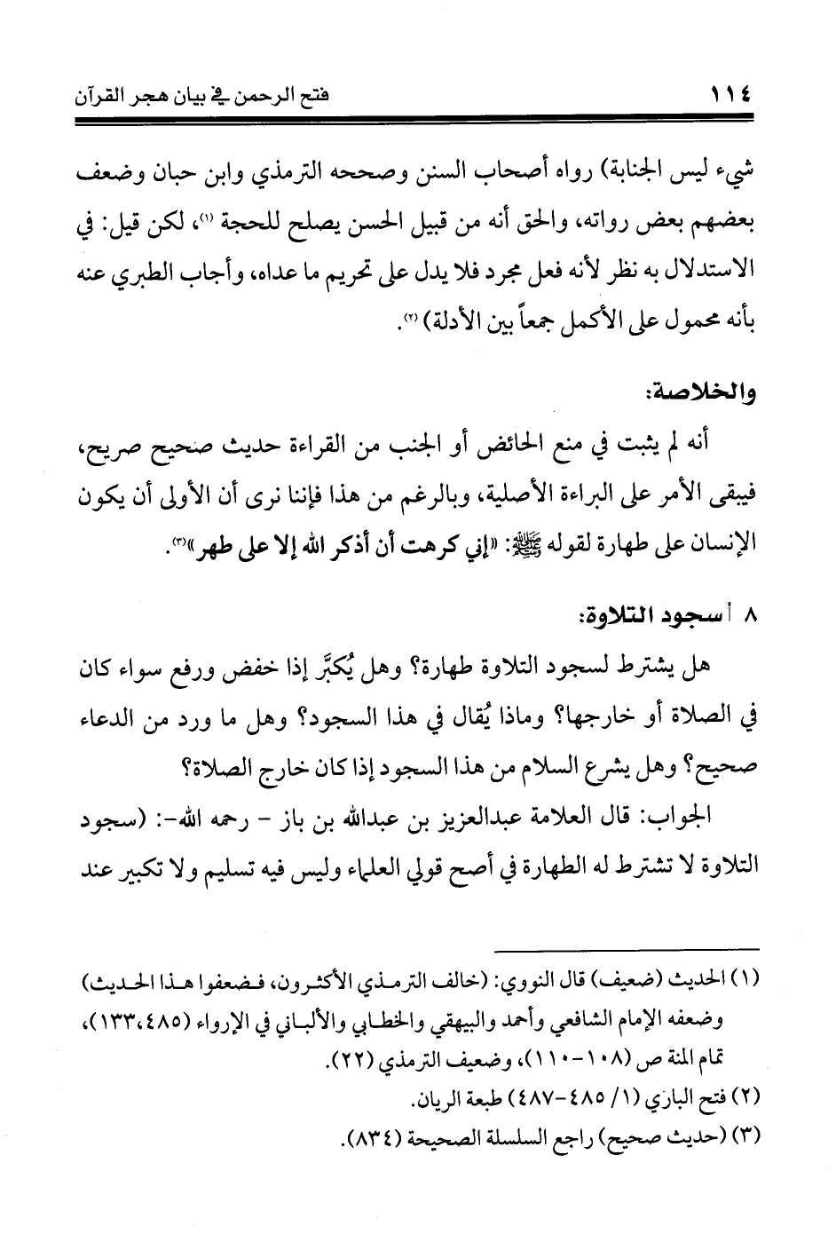 أنه لم يثبت في منع الحائض أو الجنب من القراءة حديث صحيح صريح، فيبقى الأمر على البراءة الأصلية، وعلى الرغم من هذا فإننا نرى أن الأولى أن يكون الإنسان على طهارة لقوله - صلى الله عليه وسلم -: " إني كرهت أن أذكر الله إلا على طهر " (¬3).