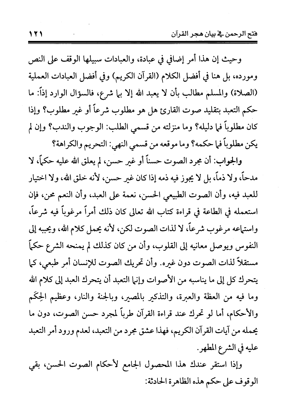 أن مجرد الصوت حسناً أو غير حسن، لم يعلق الله عليه حكماً، لا مدحاً، ولا ذماً، بل لا يجوز فيه ذمه إذا كان غير حسن، لأنه خلق الله، ولا اختيار للعبد فيه، وأن الصوت الطبيعي الحسن، نعمة على العبد، وأن النعم محن، فإن استعمله في الطاعة في قراءة كتاب الله تعالى كان ذلك أمراً مرغوباً فيه شرعاً، واستماعه مرغوب شرعاً، لا لذات الصوت لكن، لأنه يحمل كلام الله، ويحببه إلى النفوس ويوصل معانيه إلى القلوب، وأن من كان كذلك لم يمنحه الشرع حكماً مستقلاً لذات الصوت دون غيره. وأن تحريك الصوت للإنسان أمر طبعي، كما يتحرك كل إلى ما يناسبه من الأصوات وإنما التعبد أن يتحرك العبد إلى كلام الله وما فيه من العظة والعبرة، والتذكير بالمصير، وبالجنة والنار، وعظيم الحِكَم والأحكام، أما لو تحرك عند قراءة القرآن طرباً لمجرد حسن الصوت، دون ما يحمله من آيات القرآن الكريم، فهذا عشق مجرد من التعبد، لعدم ورود أمر التعبد عليه في الشرع المطهر.