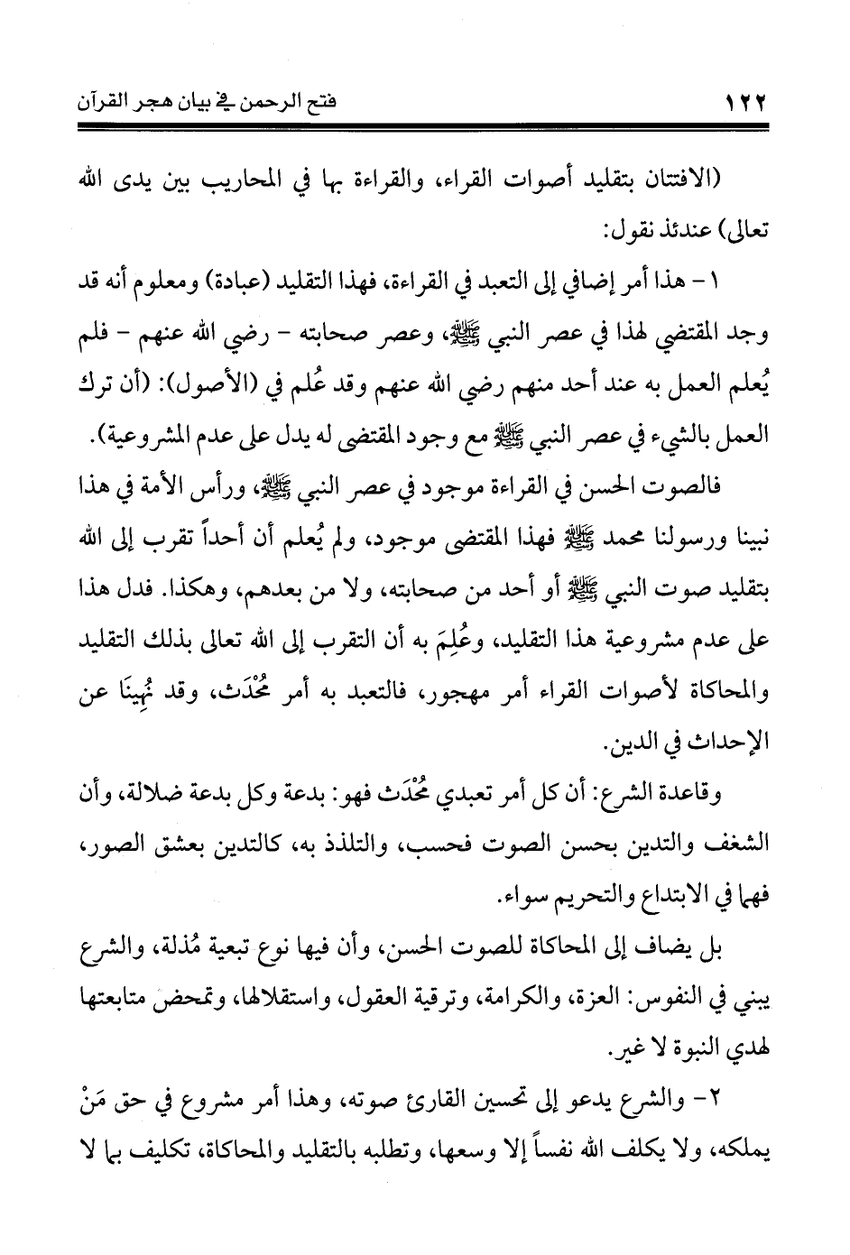 (الافتتان بتقليد أصوات القراء، والقراءة بها في المحاريب بين يدى الله تعالى) عندئذ نقول: