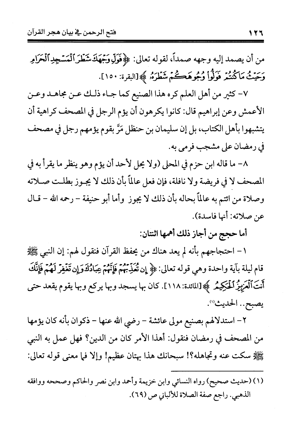 8 - ما قاله ابن حزم في المحلى (ولا يحل لأحد أن يؤم وهو ينظر ما يقرأ به في المصحف لا في فريضة ولا نافلة، فإن فعل عالماً بأن ذلك لا يجوز بطلت صلاته وصلاة من ائتم به عالماً بحاله بأن ذلك لا يجوز وأما أبوحنيفة - رحمه الله - قال عن صلاته: أنها فاسدة).