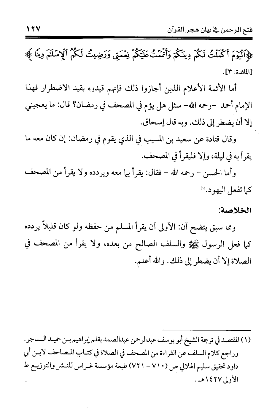 (¬1) المقتصد في ترجمة الشيخ أبويوسف عبد الرحمن عبد الصمد بقلم إبراهيم بن حميد الساجر. وراجع كلام السلف عن القراءة من المصحف في الصلاة في كتاب المصاحف لابن أبي داود تحقيق سليم الهلالي ص (710 - 721) طبعة مؤسسة غراس للنشر والتوزيع ط الأولى 1427 هـ