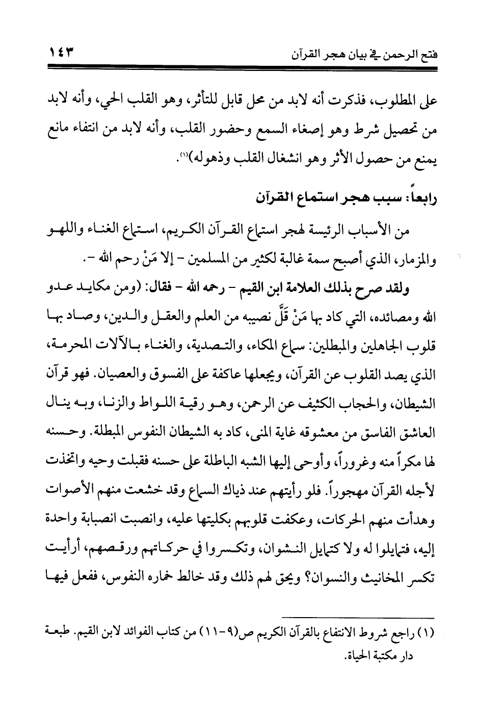 (¬1) راجع شروط الانتفاع بالقرآن الكريم ص (9 - 11) من كتاب الفوائد لابن القيم. طبعة دار مكتبة الحياة.