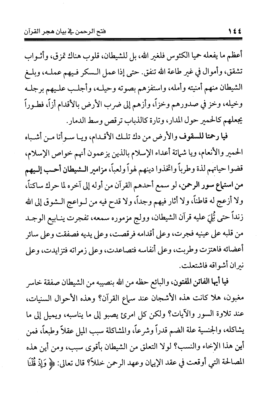 فيا رحمتا للسقوف والأرض من دك تلك الأقدام، ويا سوأتا من أشباه الحمير والأنعام، ويا شماتة أعداء الإسلام بالذين يزعمون أنهم خواص الإسلام، قضوا حياتهم لذة وطرباً واتخذوا دينهم لهواً ولعباً، مزامير الشيطان أحب إليهم من استماع سور الرحمن، لو سمع أحدهم القرآن من أوله إلى آخره لما حرك ساكناً، ولا أزعج له قاطناً، ولا أثار فيهم وجداً، ولا قدح فيه من لواعج الشوق إلى الله زنداً حتى تُلِيَ عليه قرآن الشيطان، وولج مزموره سمعه، تفجرت ينابيع الوجد من قلبه على عينيه فجرت، وعلى أقدامه فرقصت، وعلى يديه فصفقت وعلى سائر أعضائه فاهتزت وطربت، وعلى أنفاسه فتصاعدت، وعلى زمراته فتزايدت، وعلى نيران أشواقه فاشتعلت.