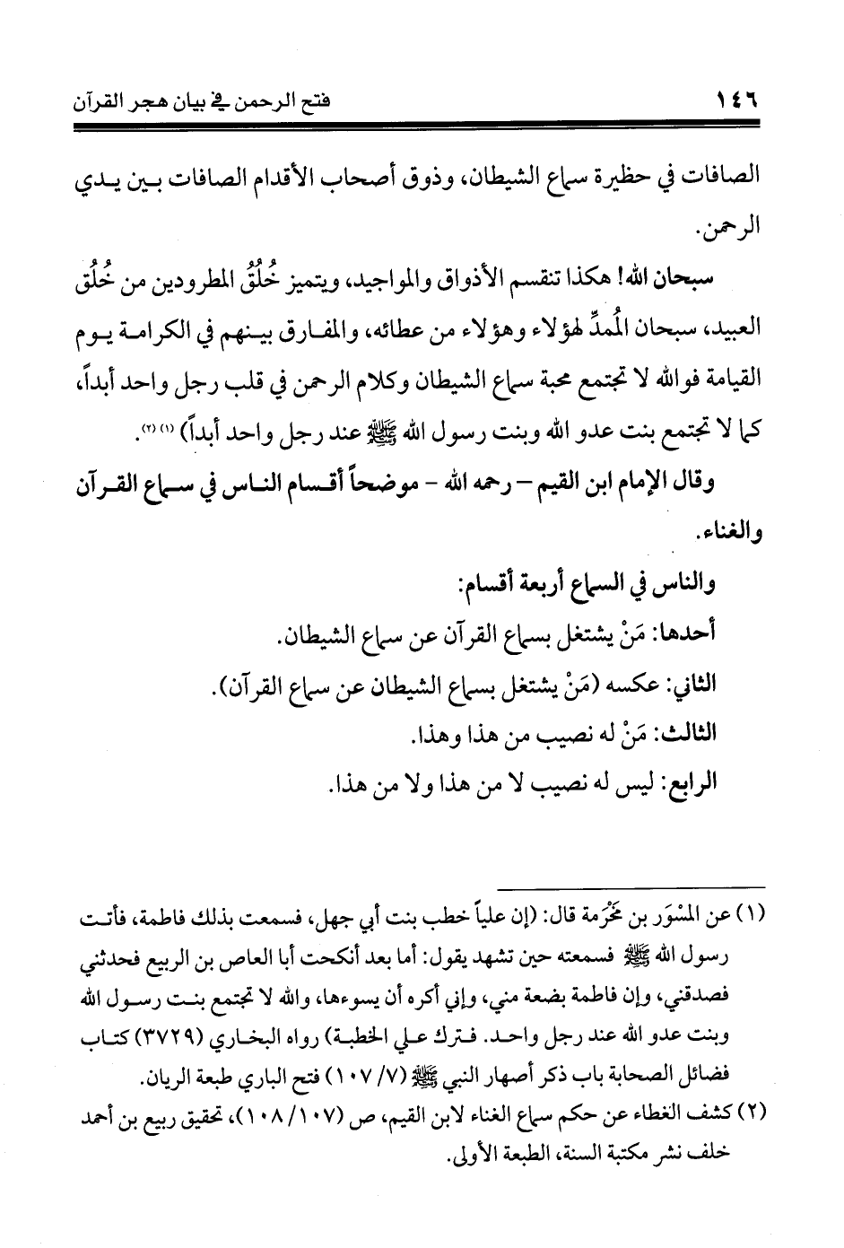 وقال الإمام ابن القيم - رحمه الله - موضحاً أقسام الناس في سماع القرآن والغناء.