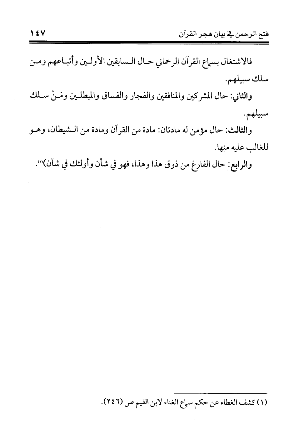 فالاشتغال بسماع القرآن الرحماني حال السابقين الأولين وأتباعهم ومن سلك سبيلهم.