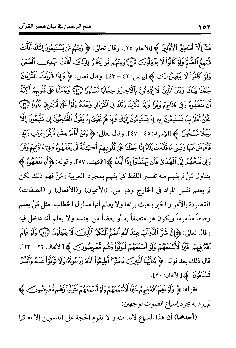 وقوله: {أَن يَفْقَهُوهُ} يتناول مَنْ لم يفهم منه تفسير اللفظ كما يفهم بمجرد العربية ومَنْ فهم ذلك لكن لم يعلم نفس المراد فى الخارج وهو من: (الأعيان) و (الأفعال) و (الصفات) المقصودة بالأمر والخبر بحيث يراها ولا يعلم أنها مدلول الخطاب: مثل مَنْ يعلم وصفاً مذموماً ويكون هو متصفاً به أو بعضاً من جنسه ولا يعلم أنه داخل فيه وقال تعالى: {إِنَّ شَرَّ الدَّوَابَّ عِندَ اللهِ الصُّمُّ الْبُكْمُ الَّذِينَ لاَ يَعْقِلُونَ * وَلَوْ عَلِمَ اللهُ فِيهِمْ خَيْرًا لَّأسْمَعَهُمْ وَلَوْ أَسْمَعَهُمْ لَتَوَلَّواْ وَّهُم مُّعْرِضُونَ} (22 - 23) سورة الأنفال. قال ذلك بعد قوله: {يَا أَيُّهَا الَّذِينَ آمَنُواْ أَطِيعُواْ اللهَ وَرَسُولَهُ وَلاَ تَوَلَّوْا عَنْهُ وَأَنتُمْ تَسْمَعُونَ} (20) سورة الأنفال.