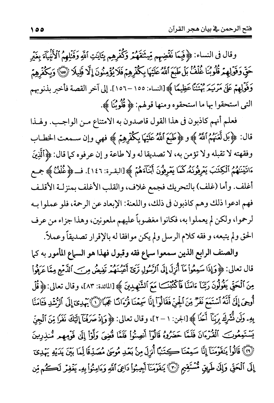 فعلم أنهم كاذبون فى هذا القول قاصدون به الامتناع من الواجب. ولهذا قال: {بَل لَّعَنَهُمُ اللَّه} و {طَبَعَ اللهُ عَلَيْهَا بِكُفْرِهِمْ} فهي وإن سمعت الخطاب وفقهته لا تقبله ولا تؤمن به، لا تصديقا له ولا طاعة وإن عرفوه كما قال: {الَّذِينَ آتَيْنَاهُمُ الْكِتَابَ يَعْرِفُونَهُ كَمَا يَعْرِفُونَ أَبْنَاءهُمْ} (146) سورة البقرة. فـ {غُلْفٌ} جمع أغلف. وأما (غلف) بالتحريك فجمع غلاف، والقلب الأغلف بمنزلة الأقلف فهم ادعوا ذلك وهم كاذبون فى ذلك، واللعنة: الابعاد عن الرحمة، فلو عملوا به لرحموا، ولكن لم يعملوا به، فكانوا مغضوباً عليهم ملعونين، وهذا جزاء من عرف الحق ولم يتبعه، وفقه كلام الرسل ولم يكن موافقا له بالإقرار تصديقاً وعملاً.