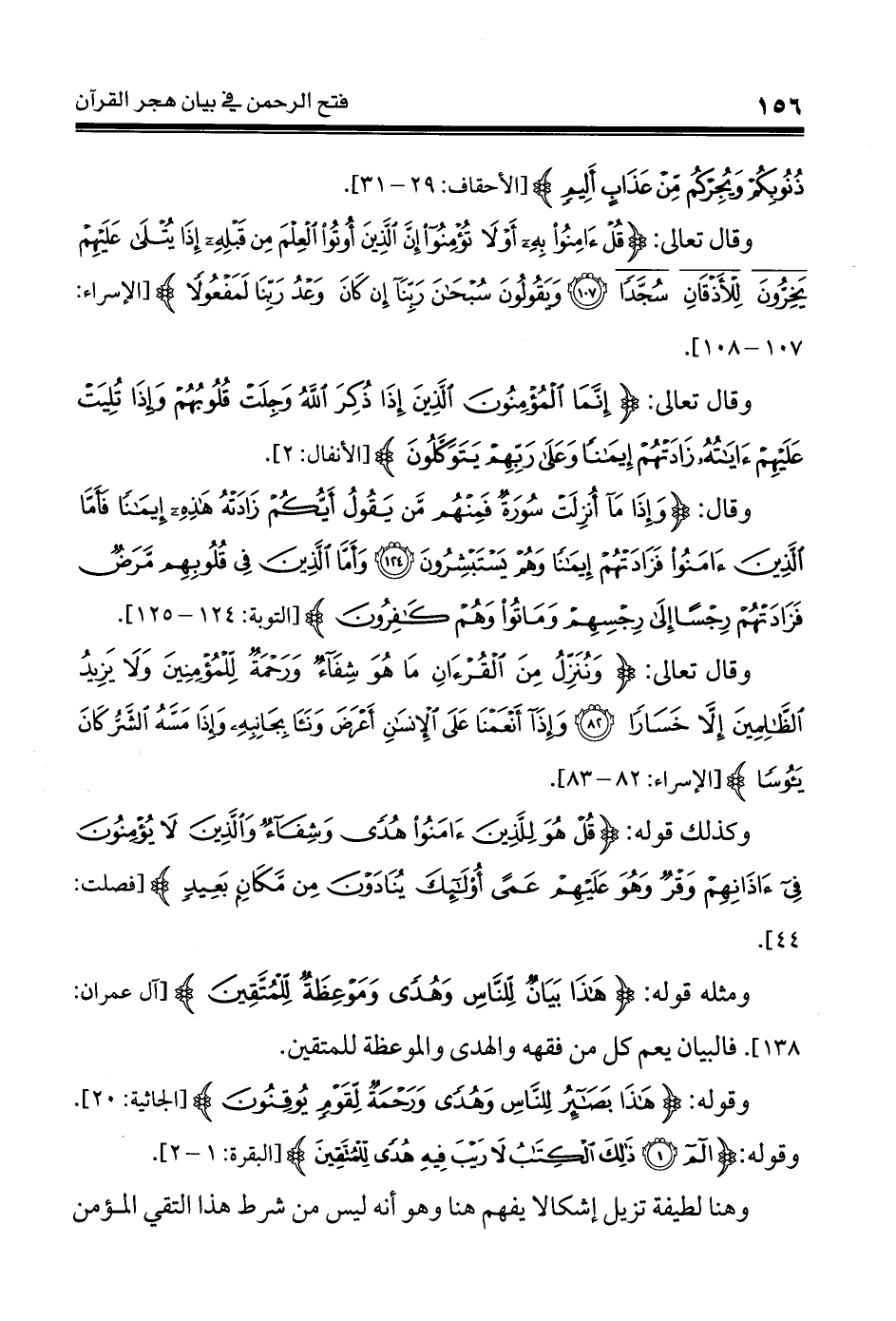 وقوله: {هَذَا بَصَائِرُ لِلنَّاسِ وَهُدًى وَرَحْمَةٌ لِّقَوْمِ يُوقِنُونَ} (20) سورة الجاثية. وقوله: {الم * ذَلِكَ الْكِتَابُ لاَ رَيْبَ فِيهِ هُدًى لِّلْمُتَّقِينَ} (1 - 2) سورة البقرة.
