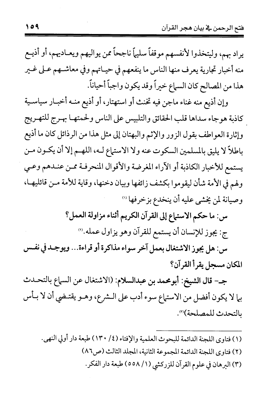 ج: يجوز للإنسان أن يستمع للقرآن وهو يزاول عمله. (¬2)