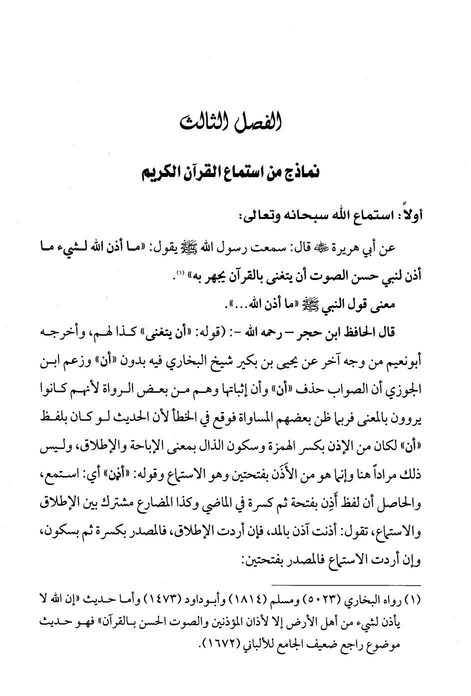 (¬1) رواه البخاري (5023) ومسلم (1814) وأبوداود (1473) وأما حديث «إن الله لا يأذن لشيء من أهل الأرض إلا لأذان المؤذنين والصوت الحسن بالقرآن» فهو حديث موضوع راجع ضعيف الجامع للألباني (1672).