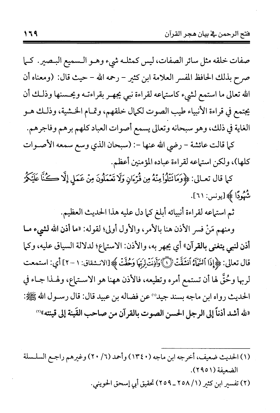 صفات خلقه مثل سائر الصفات، ليس كمثله شيء وهو السميع البصير. كما صرح بذلك الحافظ المفسر العلامة ابن كثير - رحمه الله - حيث قال: (ومعناه أن الله تعالى ما استمع لشيء كاستماعه لقراءة نبي يجهر بقراءته ويحسنها وذلك أن يجتمع في قراءة الأنبياء طيب الصوت لكمال خلقهم، وتمام الخشية، وذلك هو الغاية في ذلك، وهو سبحانه وتعالى يسمع أصوات العباد كلهم برهم وفاجرهم.