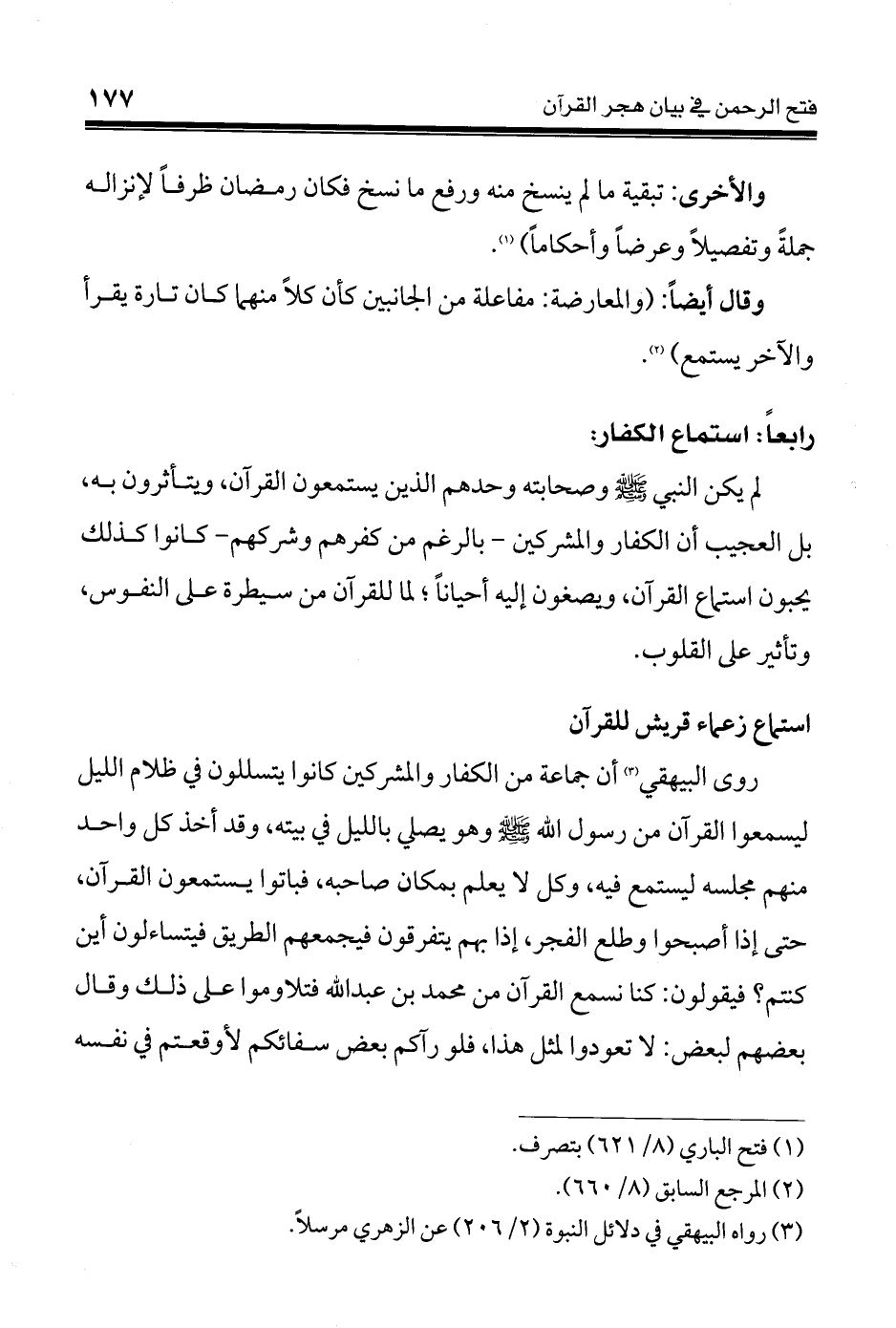روى البيهقي (¬3) أن جماعة من الكفار والمشركين كانوا يتسللون في ظلام الليل ليسمعوا القرآن من رسول الله - صلى الله عليه وسلم - وهو يصلي بالليل في بيته، وقد أخذ كل واحد منهم مجلسه ليستمع فيه، وكل لا يعلم بمكان صاحبه، فباتوا يستمعون القرآن، حتى إذا أصبحوا وطلع الفجر، إذا بهم يتفرقون فيجمعهم الطريق فيتساءلون أين كنتم؟ فيقولون: كنا نسمع القرآن من محمد بن عبد الله - صلى الله عليه وسلم - فتلاوموا على ذلك وقال بعضهم لبعض: لا تعودوا لمثل هذا، فلو رآكم بعض سفائكم لأوقعتم في نفسه