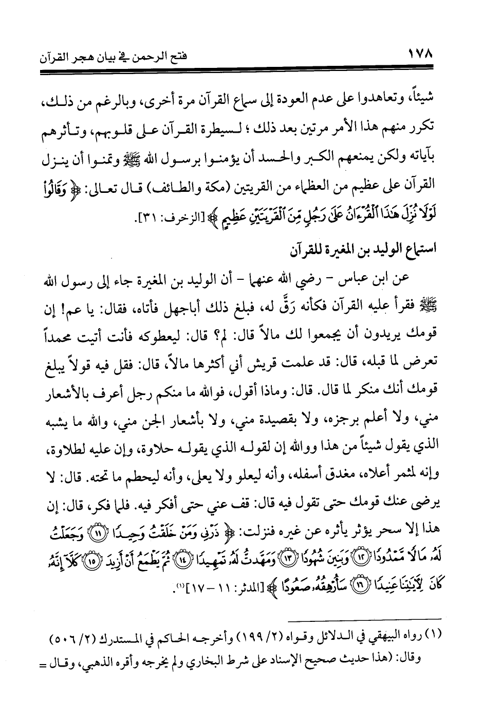 عن ابن عباس - رضي الله عنهما - أن الوليد بن المغيرة جاء إلى رسول الله - صلى الله عليه وسلم - فقرأ عليه القرآن فكأنه رَقَّ له، فبلغ ذلك أباجهل فأتاه، فقال: يا عم! إن قومك يريدون أن يجمعوا لك مالاً قال: لم؟ قال: ليعطوكه فأنت أتيت محمداً تعرض لما قبله، قال: قد علمت قريش أني أكثرها مالاً، قال: فقل فيه قولاً يبلغ قومك أنك منكر لما قال. قال: وماذا أقول، فوالله ما منكم رجل أعرف بالأشعار مني، ولا أعلم برجزه، ولا بقصيدة مني، ولا بأشعار الجن مني، والله ما يشبه الذي يقول شيئاً من هذا ووالله إن لقوله الذي يقوله حلاوة، وإن عليه لطلاوة، وإنه لمثمر أعلاه، مغدق أسفله، وأنه ليعلو ولا يعلى، وأنه ليحطم ما تحته. قال: لا يرضى عنك قولك حتى تقول فيه قال: قف عني حتى أفكر فيه. فلما فكر، قال: إن هذا إلا سحر يؤثر يأثره عن غيره فنزلت: {ذَرْنِي وَمَنْ خَلَقْتُ وَحِيدًا * وَجَعَلْتُ لَهُ مَالًا مَّمْدُودًا * وَبَنِينَ شُهُودًا * وَمَهَّدتُّ لَهُ تَمْهِيدًا * ثُمَّ يَطْمَعُ أَنْ أَزِيدَ * كَلَّا إِنَّهُ كَانَ لِآيَاتِنَا عَنِيدًا * سَأُرْهِقُهُ صَعُودًا ...} [المدثر:11 - 30] (¬1).