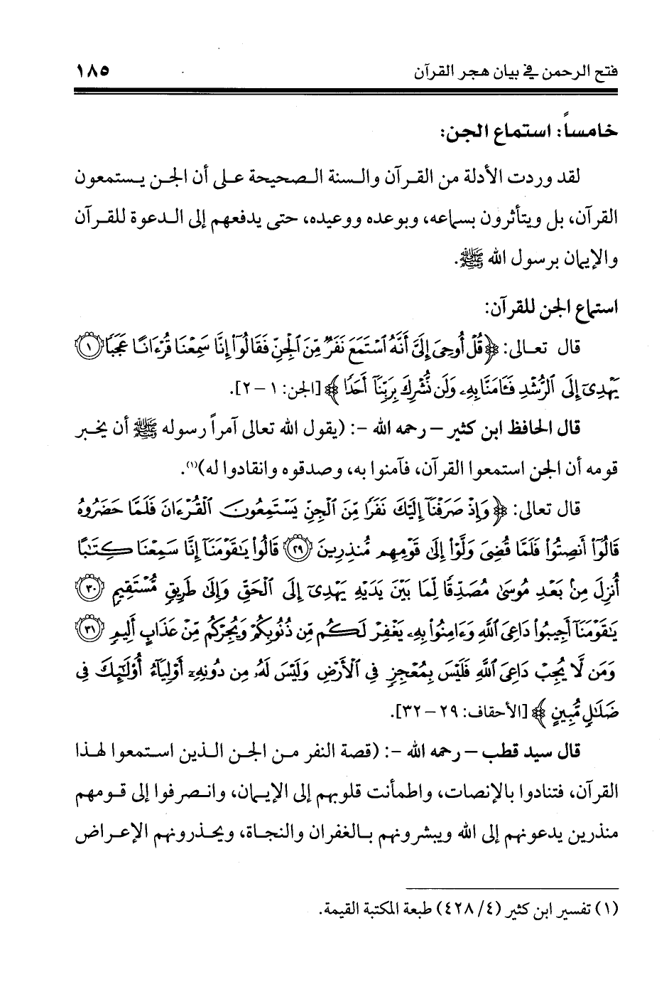 قال تعالى: {وَإِذْ صَرَفْنَا إِلَيْكَ نَفَرًا مِّنَ الْجِنِّ يَسْتَمِعُونَ الْقُرْآنَ فَلَمَّا حَضَرُوهُ قَالُوا أَنصِتُوا فَلَمَّا قُضِيَ وَلَّوْا إِلَى قَوْمِهِم مُّنذِرِينَ (29) قَالُوا يَا قَوْمَنَا إِنَّا سَمِعْنَا كِتَابًا أُنزِلَ مِن بَعْدِ مُوسَى مُصَدِّقًا لِّمَا بَيْنَ يَدَيْهِ يَهْدِي إِلَى الْحَقِّ وَإِلَى طَرِيقٍ مُّسْتَقِيمٍ (30) يَا قَوْمَنَا أَجِيبُوا دَاعِيَ اللَّهِ وَآمِنُوا بِهِ يَغْفِرْ لَكُم مِّن ذُنُوبِكُمْ وَيُجِرْكُم مِّنْ عَذَابٍ أَلِيمٍ (31) وَمَن لَّا يُجِبْ دَاعِيَ اللَّهِ فَلَيْسَ بِمُعْجِزٍ فِي الْأَرْضِ وَلَيْسَ لَهُ مِن دُونِهِ أَولِيَاء أُوْلَئِكَ فِي ضَلَالٍ مُّبِينٍ} (29 - 32) سورة الأحقاف.