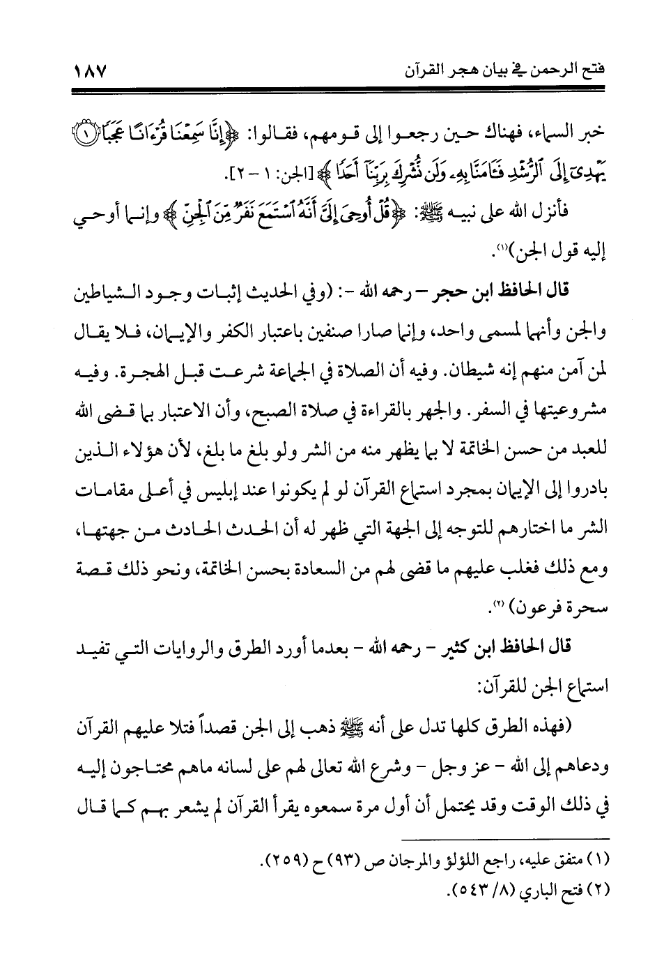 (وفي الحديث إثبات وجود الشياطين والجن وأنهما لمسمى واحد، وإنما صارا صنفين باعتبار الكفر والإيمان، فلا يقال لمن آمن منهم إنه شيطان. وفيه أن الصلاة في الجماعة شرعت قبل الهجرة. وفيه مشروعيتها في السفر. والجهر بالقراءة في صلاة الصبح، وأن الاعتبار بما قضي الله للعبد من حسن الخاتمة لا بما يظهر منه من الشر ولو بلغ ما بلغ، لأن هؤلاء الذين بادروا إلى الإيمان بمجرد استماع القرآن لو لم يكونوا عند إبليس في أعلى مقامات الشر ما اختارهم للتوجه إلى الجهة التي ظهر له أن الحدث الحادث من جهتها، ومع ذلك فغلب عليهم ما قضى لهم من السعادة بحسن الخاتمة، ونحو ذلك قصة سحرة فرعون) (¬2).