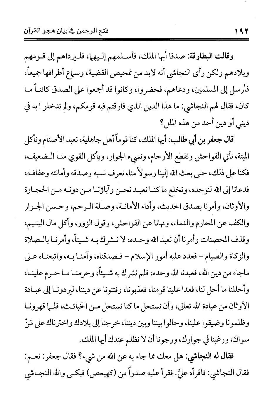 قال جعفر بن أبي طالب: أيها الملك، كنا قوماً أهل جاهلية، نعبد الأصنام ونأكل الميتة، نأتي الفواحش ونقطع الأرحام، ونسىء الجوار، ويأكل القوي منا الضعيف، فكنا على ذلك، حتى بعث الله إلينا رسولاً منا، نعرف نسبه وصدقه وأمانته وعفافه، فدعانا إلى الله لنوحده، ونخلع ما كنا نعبد نحن وآباؤنا من دونه من الحجارة والأوثان، وأمرنا بصدق الحديث، وأداء الأمانة، وصلة الرحم، وحسن الجوار والكف عن المحارم والدماء، ونهانا عن الفواحش، وقول الزور، وأكل مال اليتيم، وقذف المحصنات وأمرنا أن نعبد الله وحده، لا نشرك به شيئاً، وأمرنا بالصلاة والزكاة والصيام - فعدد عليه أمور الإسلام - فصدقناه، وآمنا به، واتبعناه على ماجاء من دين الله، فعبدنا الله وحده، فلم نشرك به شيئاً، وحرمنا ما حرم علينا، وأحللنا ما أحل لنا، فعدا علينا قومنا، فعذبونا، وفتنونا عن ديننا، ليردونا إلى عبادة الأوثان من عبادة الله تعالى، وأن نستحل ما كنا نستحل من الخبائث، فلما قهرونا وظلمونا وضيقوا علينا، وحالوا بيننا وبين ديننا، خرجنا إلى بلادك واخترناك على مَنْ سواك، ورغبنا في جوارك، ورجونا أن لا نظلم عندك أيها الملك.