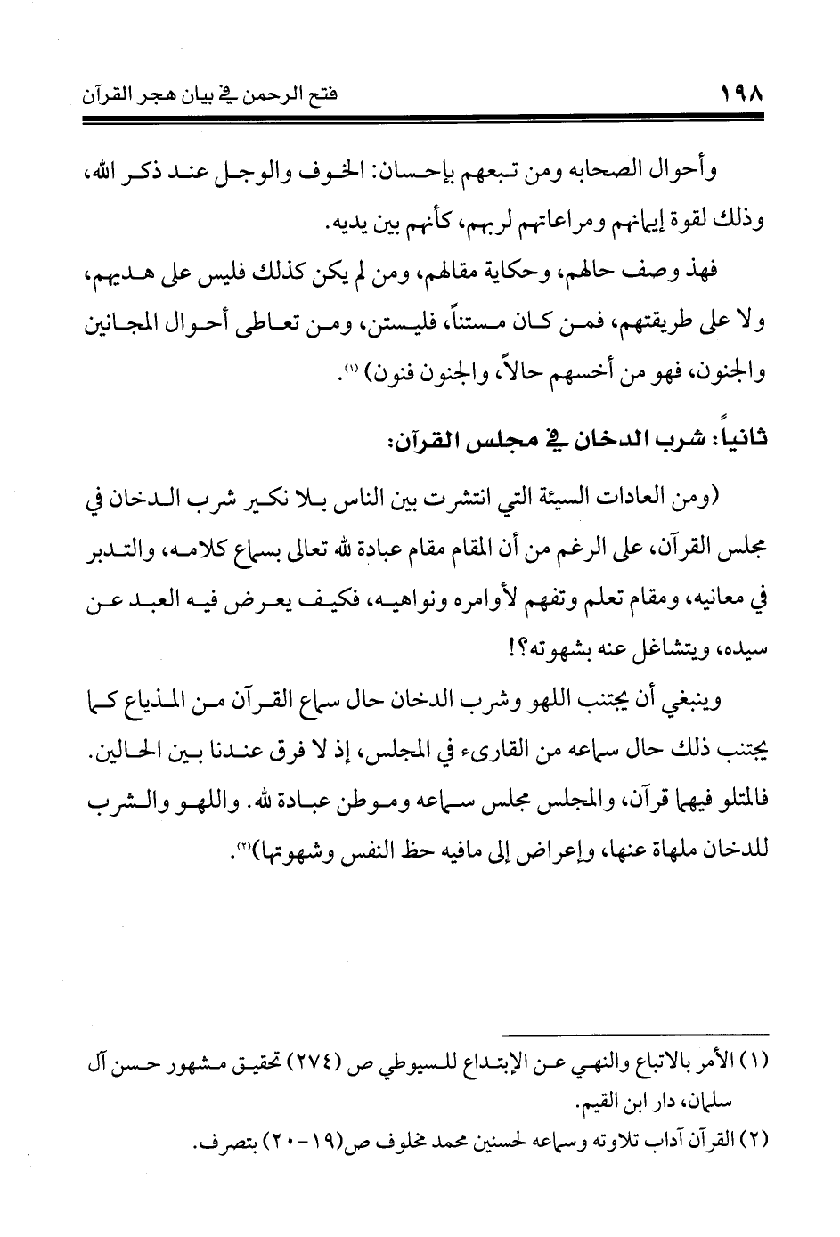 (ومن العادات السيئة التي انتشرت بين الناس بلا نكير شرب الدخان في مجلس القرآن، على الرغم من أن المقام مقام عبادة لله تعالى بسماع كلامه، والتدبر في معانيه، ومقام تعلم وتفهم لأوامره ونواهيه، فكيف يعرض فيه العبد عن سيده، ويتشاغل عنه بشهوته؟!