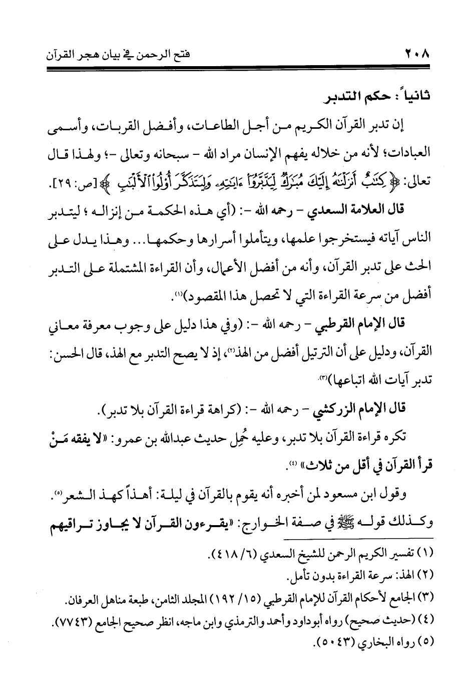 (أي هذه الحكمة من إنزاله؛ ليتدبر الناس آياته فيستخرجوا علمها، ويتأملوا أسرارها وحكمها ... وهذا يدل على الحث على تدبر القرآن، وأنه من أفضل الأعمال، وأن القراءة المشتملة على التدبر أفضل من سرعة القراءة التي لا تحصل هذا المقصود) (¬1).