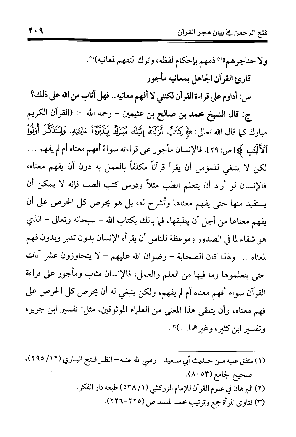 (القرآن الكريم مبارك كما قال الله - تعالى -: {كِتَابٌ أَنزَلْنَاهُ إِلَيْكَ مُبَارَكٌ لِّيَدَّبَّرُوا آيَاتِهِ وَلِيَتَذَكَّرَ أُوْلُوا الْأَلْبَابِ} (29) سورة ص. فالإنسان مأجور على قراءته سواءً أفهم معناه أم لم يفهم ... لكن لا ينبغي للمؤمن أن يقرأ قرآناً مكلفاً بالعمل به دون أن يفهم معناه، فالإنسان لو أراد أن يتعلم الطب مثلاً ودرس كتب الطب فإنه لا يمكن أن يستفيد منها حتى يفهم معناها وتُشرح له، بل هو يحرص كل الحرص على أن يفهم معناها من أجل أن يطبقها، فما بالك بكتاب الله - سبحانه وتعالى - الذي هو شفاء لما في الصدور وموعظة للناس أن يقرأه الإنسان بدون تدبر وبدون فهم لمعناه ... ولهذا كان الصحابة - رضوان الله عليهم - لا يتجاوزون عشر آيات حتى يتعلموها وما فيها من العلم والعمل، فالإنسان مثاب ومأجور على قراءة القرآن سواء أفهم معناه أم لم يفهم، ولكن ينبغي له أن يحرص كل الحرص على فهم معناه، وأن يتلقى هذا المعنى من العلماء الموثوقين، مثل: تفسير ابن جرير، وتفسير ابن كثير، وغيرهما ...) (¬3).