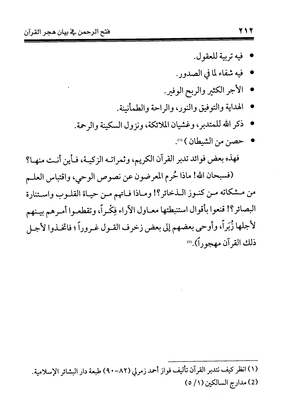 فهذه بعض فوائد تدبر القرآن الكريم، وثمراته الزكية، فأين أنت منها؟ (فسبحان الله! ماذا حُرم المعرضون عن نصوص الوحي، واقتباس العلم من مشكاته من كنوز الذخائر؟! وماذا فاتهم من حياة القلوب واستنارة البصائر؟! قنعوا بأقوال استنبطتها معاول الآراء فِكْراً، وتقطعوا أمرهم بينهم لأجلها زُبَراً، وأوحى بعضهم إلى بعض زخرف القول غروراً؛ فاتخذوا لأجل ذلك القرآن مهجوراً). (¬2)
