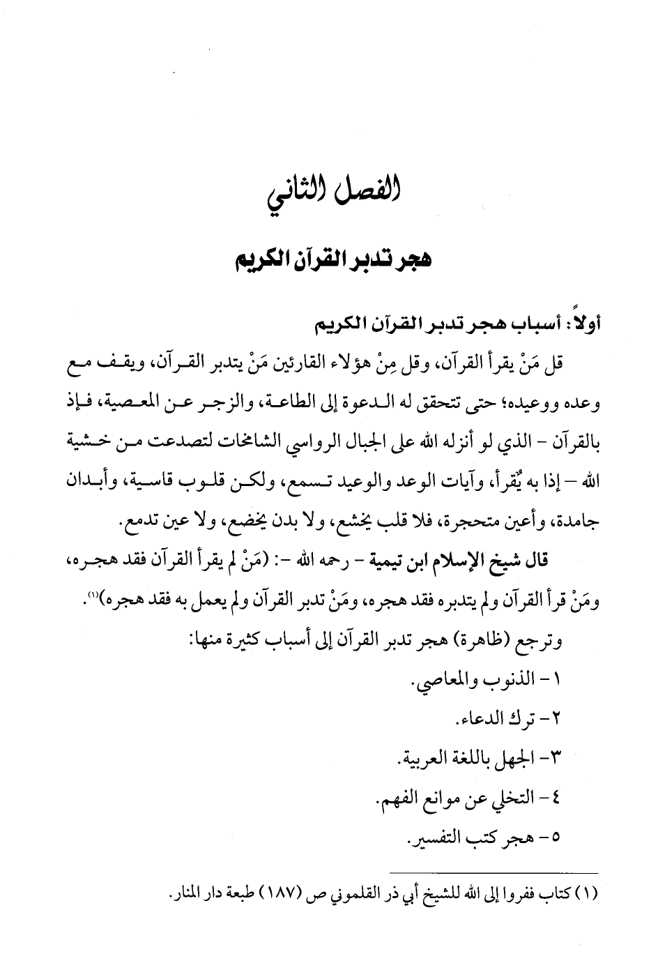 (مَنْ لم يقرأ القرآن فقد هجره، ومَنْ قرأ القرآن ولم يتدبره فقد هجره، ومَنْ تدبر القرآن ولم يعمل به فقد هجره) (¬1).