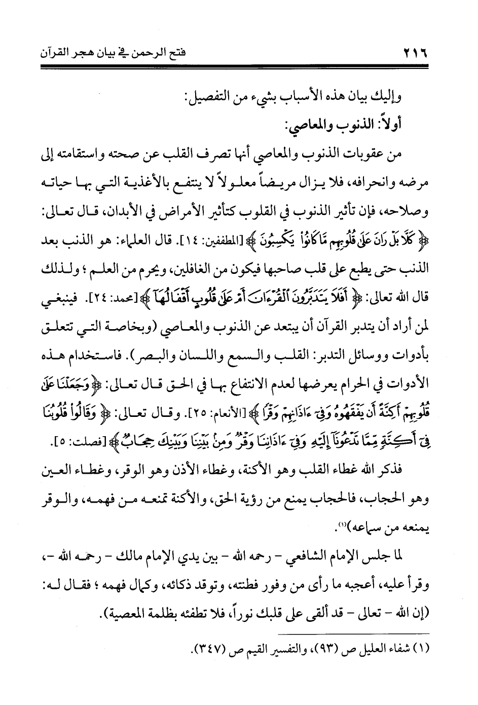 من عقوبات الذنوب والمعاصي أنها تصرف القلب عن صحته واستقامته إلى مرضه وانحرافه، فلا يزال مريضاً معلولاً لا ينتفع بالأغذية التي بها حياته وصلاحه، فإن تأثير الذنوب في القلوب كتأثير الأمراض في الأبدان، قال تعالى: {كَلَّا بَلْ رَانَ عَلَى قُلُوبِهِم مَّا كَانُوا يَكْسِبُونَ} (14) سورة المطففين. قال العلماء: هو الذنب بعد الذنب حتى يطبع على قلب صاحبها فيكون من الغافلين، ويحرم من العلم؛ ولذلك قال الله تعالى: {أَفَلَا يَتَدَبَّرُونَ الْقُرْآنَ أَمْ عَلَى قُلُوبٍ أَقْفَالُهَا} (24) سورة محمد. فينبغي لمن أراد أن يتدبر القرآن أن يبتعد عن الذنوب والمعاصي (وبخاصة التي تتعلق بأدوات ووسائل التدبر: القلب والسمع واللسان والبصر. فاستخدام هذه الأدوات في الحرام يعرضها لعدم الانتفاع بها في الحق قال تعالى: {وَجَعَلْنَا عَلَى قُلُوبِهِمْ أَكِنَّةً أَن يَفْقَهُوهُ وَفِي آذَانِهِمْ وَقْرًا} (25) سورة الأنعام. وقال تعالى: {وَقَالُوا قُلُوبُنَا فِي أَكِنَّةٍ مِّمَّا تَدْعُونَا إِلَيْهِ وَفِي آذَانِنَا وَقْرٌ وَمِن بَيْنِنَا وَبَيْنِكَ حِجَابٌ} (5) سورة فصلت.