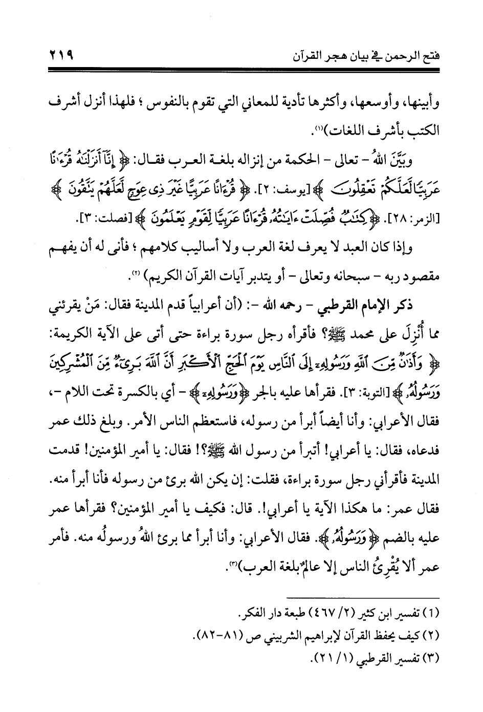 (أن أعرابياً قدم المدينة فقال: مَنْ يقرئني مما أُنْزِلَ على محمد - صلى الله عليه وسلم -؟ فأقرأه رجل سورة براءة حتى أتى على الآية الكريمة: {وَأَذَانٌ مِّنَ اللهِ وَرَسُولِهِ إِلَى النَّاسِ يَوْمَ الْحَجِّ الأَكْبَرِ أَنَّ اللهَ بَرِيءٌ مِّنَ الْمُشْرِكِينَ وَرَسُولُهُ} (3) سورة التوبة. فقرأها عليه بالجر {وَرَسُولِهِ} - أي بالكسرة تحت اللام -، فقال الأعرابي: وأنا أيضاً أبرأ من رسوله، فاستعظم الناس الأمر. وبلغ ذلك عمر فدعاه، فقال: يا أعرابي! أتبرأ من رسول الله - صلى الله عليه وسلم -؟! فقال: يا أمير المؤمنين! قدمت المدينة فأقرأني رجل سورة براءة، فقلت: إن يكن الله برئ من رسوله فأنا أبرأ منه. فقال عمر: ما هكذا الآية يا أعرابي!. قال: فكيف يا أمير المؤمنين؟ فقرأها عمر عليه بالضم {وَرَسُولُهُ}. فقال الأعرابي: وأنا أبرأ مما برئ اللهُ ورسولُه منه. فأمر عمر ألا يُقْرِئُ الناس إلا عالمٌ بلغة العرب) (¬3).