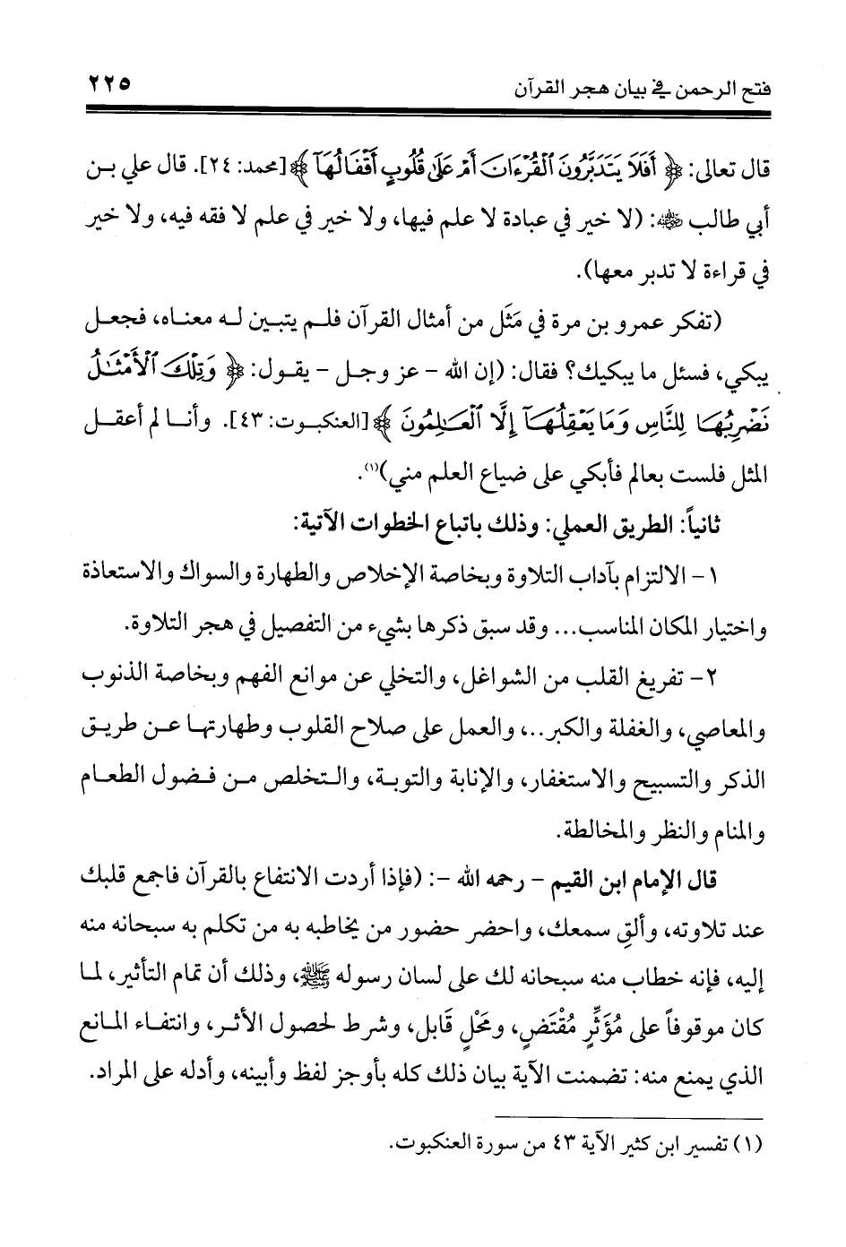 قال تعالى: {أَفَلَا يَتَدَبَّرُونَ الْقُرْآنَ أَمْ عَلَى قُلُوبٍ أَقْفَالُهَا} (24) سورة محمد. قال علي بن أبي طالب - رضي الله عنه -: (لا خير في عبادة لا علم فيها، ولا خير في علم لا فقه فيه، ولا خير في قراءة لا تدبر معها).