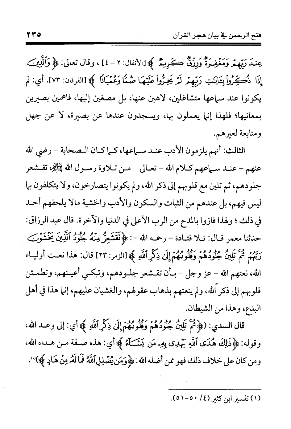 عِندَ رَبِّهِمْ وَمَغْفِرَةٌ وَرِزْقٌ كَرِيمٌ} (2 - 4) سورة الأنفال، وقال تعالى {وَالَّذِينَ إِذَا ذُكِّرُوا بِآيَاتِ رَبِّهِمْ لَمْ يَخِرُّوا عَلَيْهَا صُمًّا وَعُمْيَانًا} (73) سورة الفرقان. أي: لم يكونوا عند سماعها متشاغلين، لاهين عنها، بل مصغين إليها، فاهمين بصيرين بمعانيها؛ فلهذا إنما يعملون بها، ويسجدون عندها عن بصيرة، لا عن جهل ومتابعة لغيرهم.