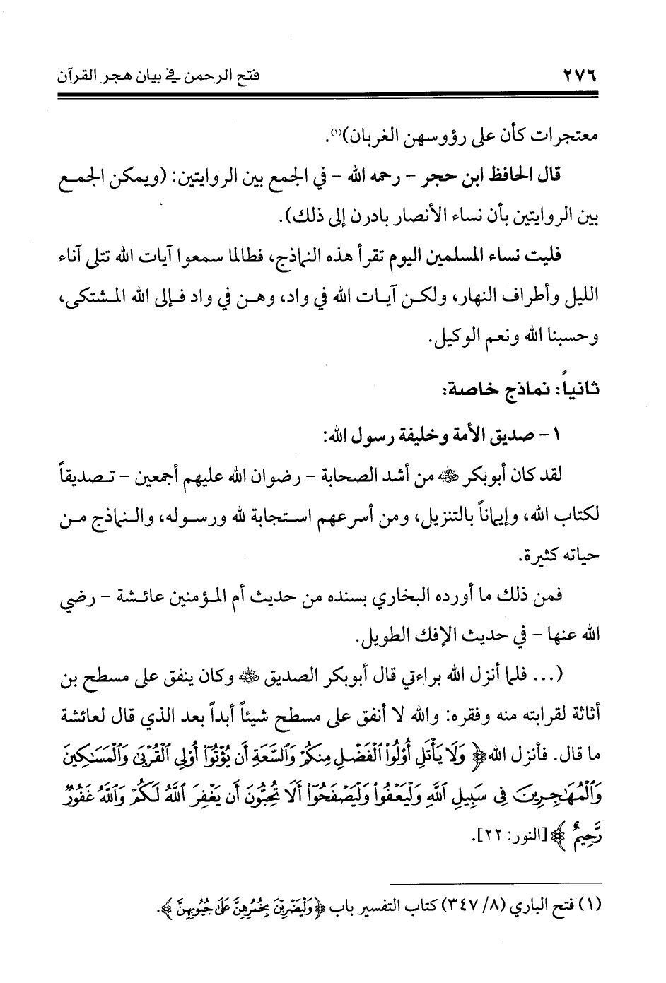 (¬1) فتح الباري (8/ 347) كتاب التفسير باب {وَلْيَضْرِبْنَ بِخُمُرِهِنَّ عَلَى جُيُوبِهِنَّ}.